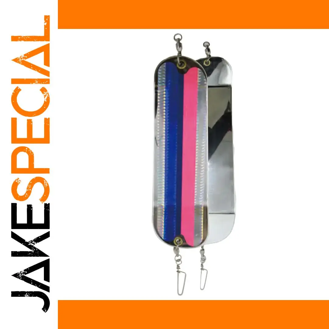 Experience the thrill of successful fishing with this highly visible, durable fishing accessory. Crafted from high-quality ABS plastic and metal, this trolling flasher is designed to attract fish efficiently in sea fishing scenarios. Its sleek, elongated oval shape ensures minimal water resistance, while the metallic, iridescent finish enhances reflectivity underwater. The front features a vibrant, multicolored striped pattern with bold blue, white, and pink vertical stripes, making it eye-catching and lively. The back has a plain metallic silver surface, providing a refined, modern look. Both have rounded ends to ensure smooth movement, and attachment rings at the top and bottom allow secure mounting on fishing lines or rigs. This versatile tool is perfect for professional anglers and hobbyists alike, boosting your chances of a successful catch with its realistic and high-impact visual design.