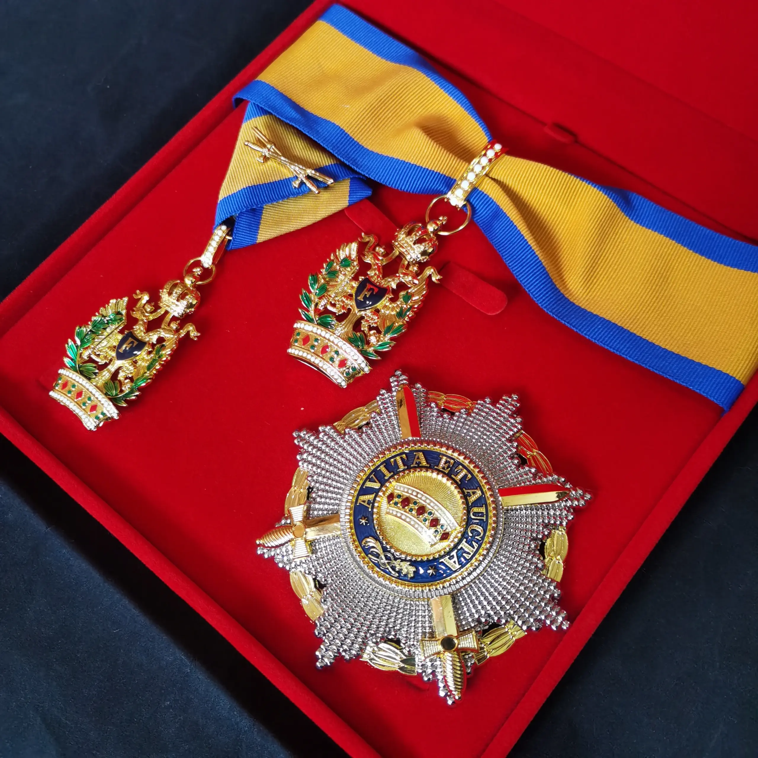 Imagine owning this stunning medal and badge set that exudes historical charm and regal elegance. Crafted from high-quality metal, the set features a large, ornate central medal with a radiant starburst design, framed by textured ridges that highlight its intricate craftsmanship. Bright gold and silver finishes elevate its luxurious appearance, giving it a prestigious presence. Attached to a bold yellow and blue ribbon tied into an elegant bow, the set showcases double-headed eagle pendants adorned with vibrant enamel accents in green, red, blue, and black, crowned with tiny caps that emphasize their heraldic significance. Whether displayed as a decoration or added to your collection, this set embodies vintage sophistication and timeless patriotism, making it a captivating addition for any enthusiast or collector.