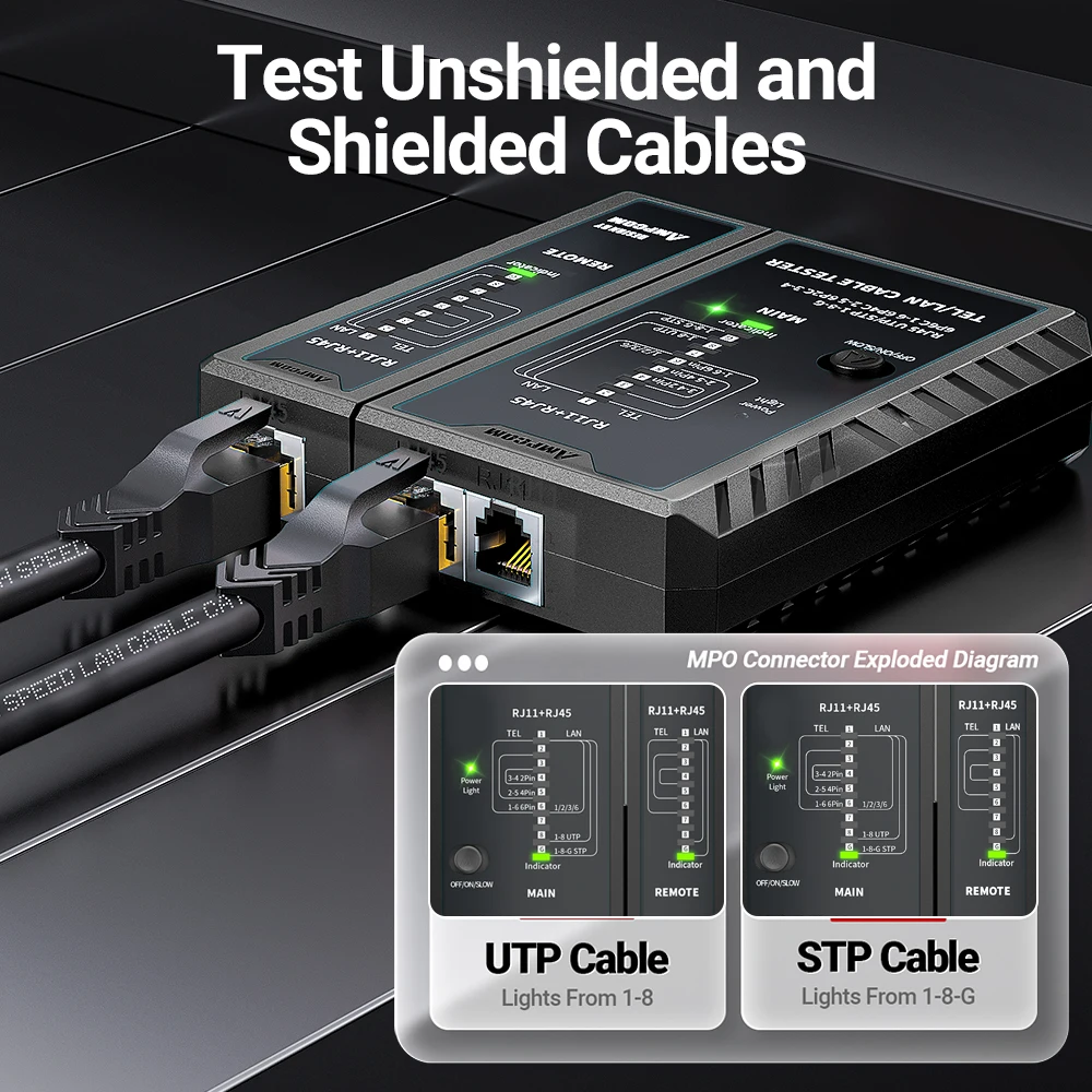 - Offers automatic and manual test modes with fast and slow switching, enabling thorough inspection of shielded (STP) and unshielded (UTP) cables for maximum reliability.