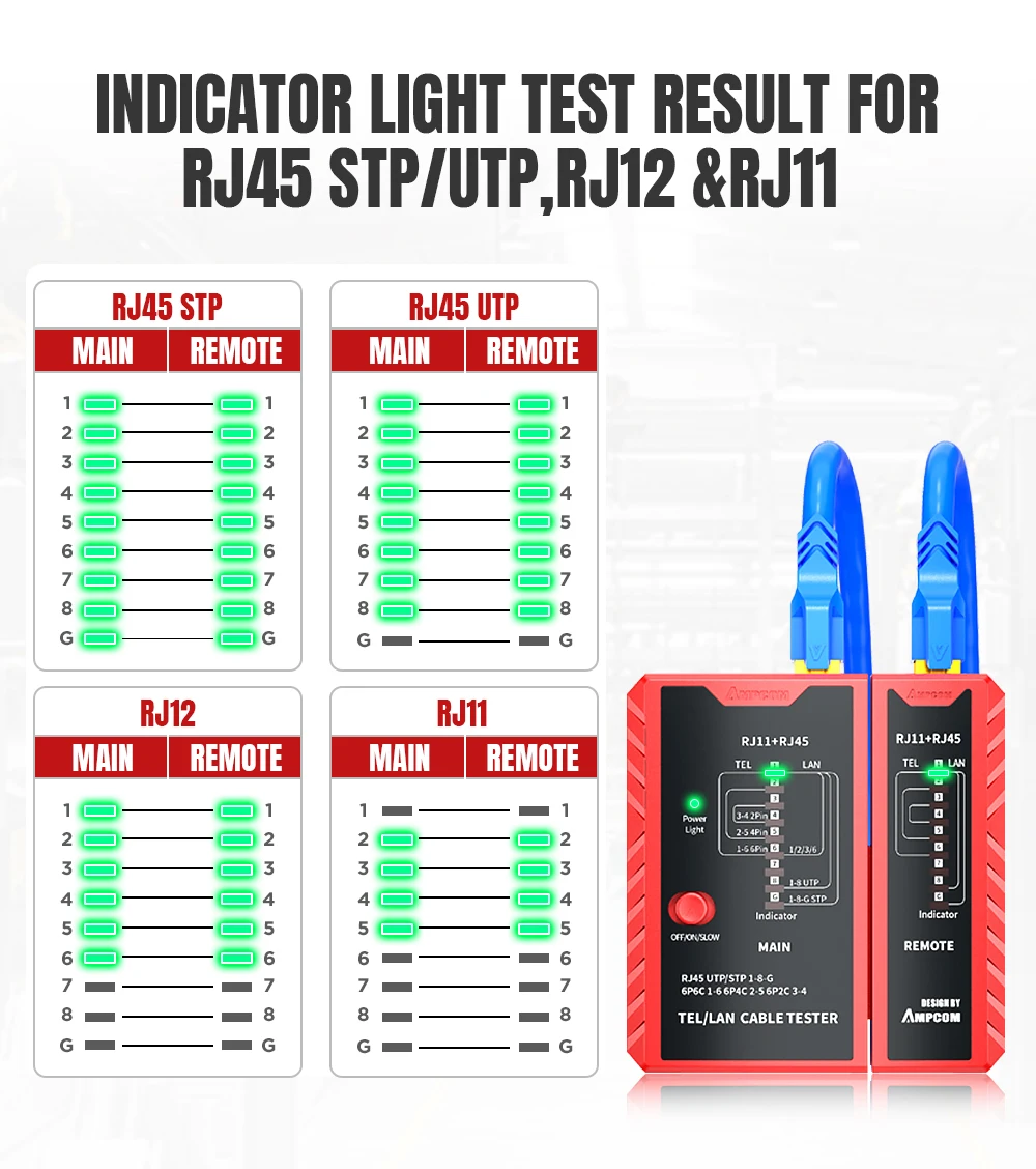 - Features a clear LED display to quickly detect faults like open circuits, shorts, crossed pairs, and disordered wiring, with lights indicating specific issues from 1–8 (UTP) or 1–G (STP).