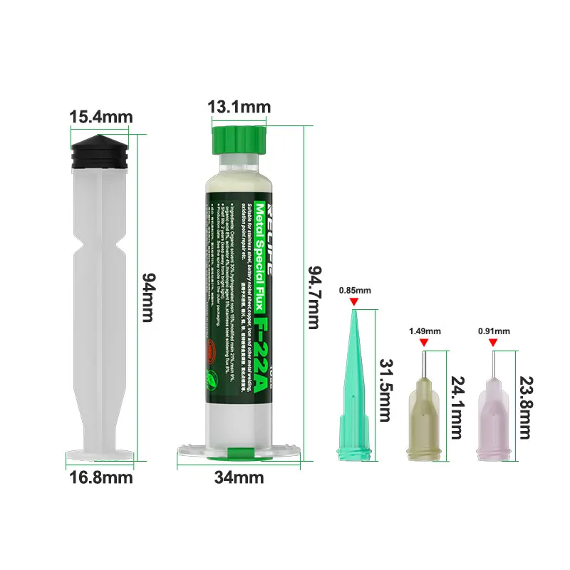 Experience the convenience and precision of this RELIFE F-22A Metal Flux Paste, designed to elevate your soldering projects. Its sleek syringe-type design features a white push rod and a pink-tinted needle tip for effortless application. The vibrant green nozzle and metallic needle tip accessories enhance control and accuracy during delicate repairs. Crafted from high-quality, environmentally friendly raw materials, this flux paste is halogen-free, non-corrosive, and RoHS compliant, ensuring safety and reliability. It offers excellent thermal conductivity and high insulation resistance, making it ideal for repairing oxide layers, welding stainless steel, copper, nickel sheets, and more. Its translucent, non-conductive formula guarantees bright, full joints with enhanced fluidity for professional results. This versatile product is perfect for intricate electrical repairs and welding needs with consistent stability across multiple temperatures.