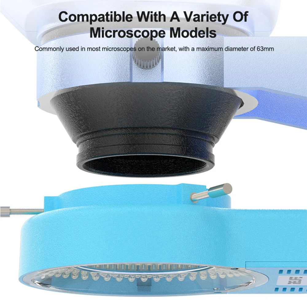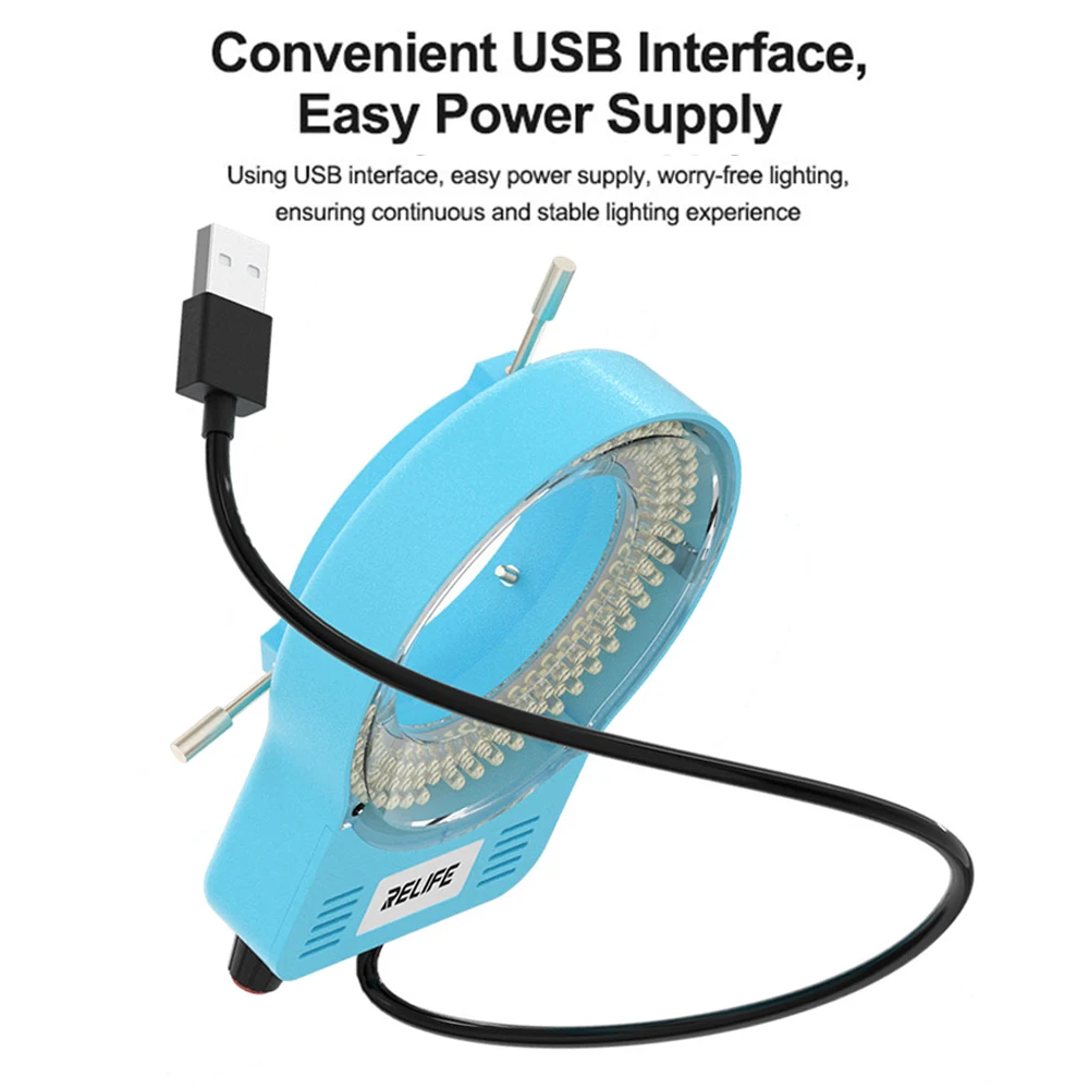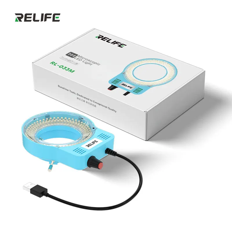 The RELIFE RL-033M 144-LED microscope ring light offers bright, uniform illumination with a color temperature of 10,000-12,000K and an illumination of 16,000 Lux at 25cm. Its compact, lightweight design measures 135mm x 32mm x 97mm, weighing only 128g net, and features a sturdy blue body with a transparent inner ring showcasing 144 evenly spaced LED beads. The light provides adjustable brightness from 0% to 100% via a convenient USB interface, consumes 4.5W to 6W of power, and outputs 5V 1A. It’s compatible with microscopes up to 63mm in diameter, making it ideal for laboratory, precision, and educational work.