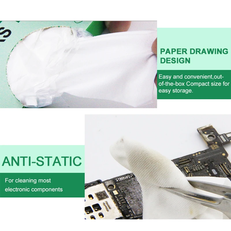 Experience spotless cleaning with these 50 anti-static cleanroom wipes designed for delicate electronic maintenance. Made of soft, plastic material, these dust-free, chemical-free cloths are ideal for cleaning mobile phones, tablets, and cameras, ensuring a safe, lint-free surface. Their gentle texture and anti-static properties make them perfect for high-precision tasks, preventing static buildup and dust particles. Packaged in a sleek green and white box featuring a circular cutout to reveal the plush white wipes inside, this set provides a convenient, professional solution for electronics enthusiasts and technicians seeking reliable, high-quality cleaning wipes.