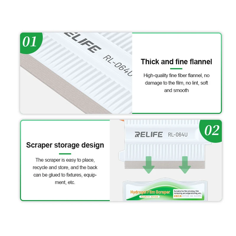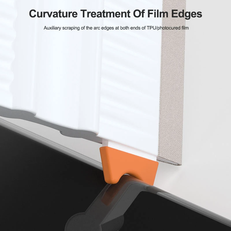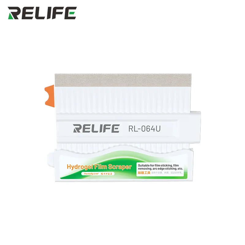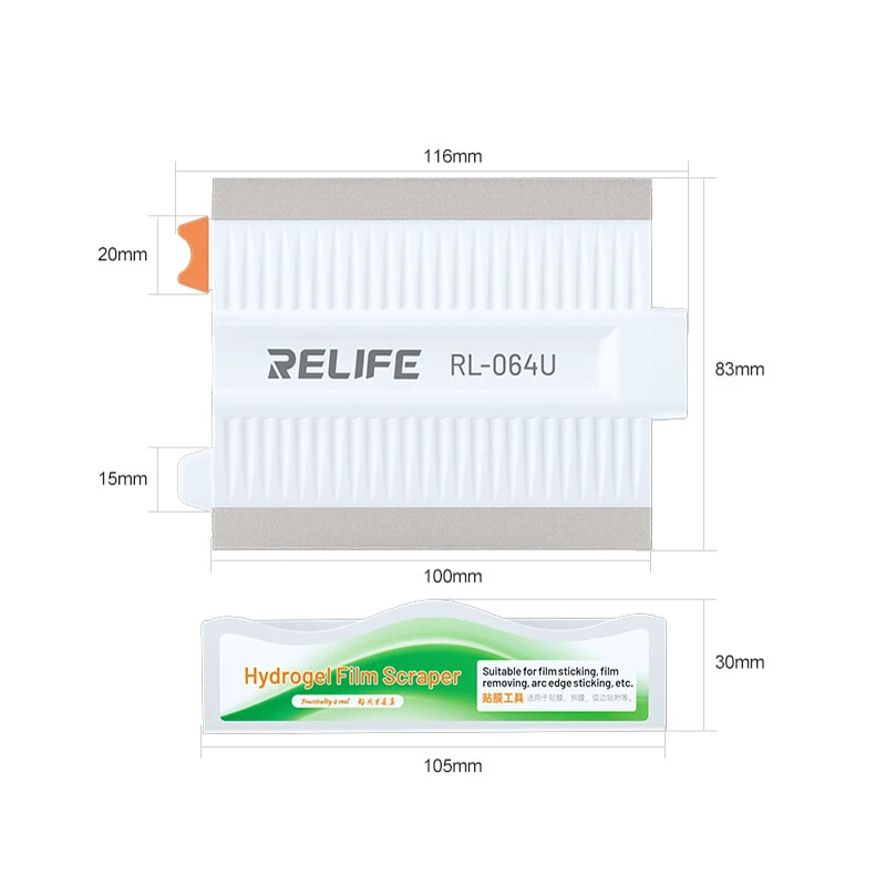 The RELIFE RL-064U multi-function film scraper tool, measuring 83mm x 116mm, is designed for precise film application, removal, and arc edge sticking on mobile phone LCD screens. Its ergonomic, minimalist design features a white ribbed surface for easy grip, accented by a vibrant orange handle for added control. The transparent mounting clip ensures stability during use. Suitable for various phone models, this reusable tool is perfect for DIY enthusiasts or professionals, offering easy storage and compatibility with screen protector films. Available as a single piece or a two-piece set, it provides reliable, versatile support for screen protection projects with a sleek, modern aesthetic.