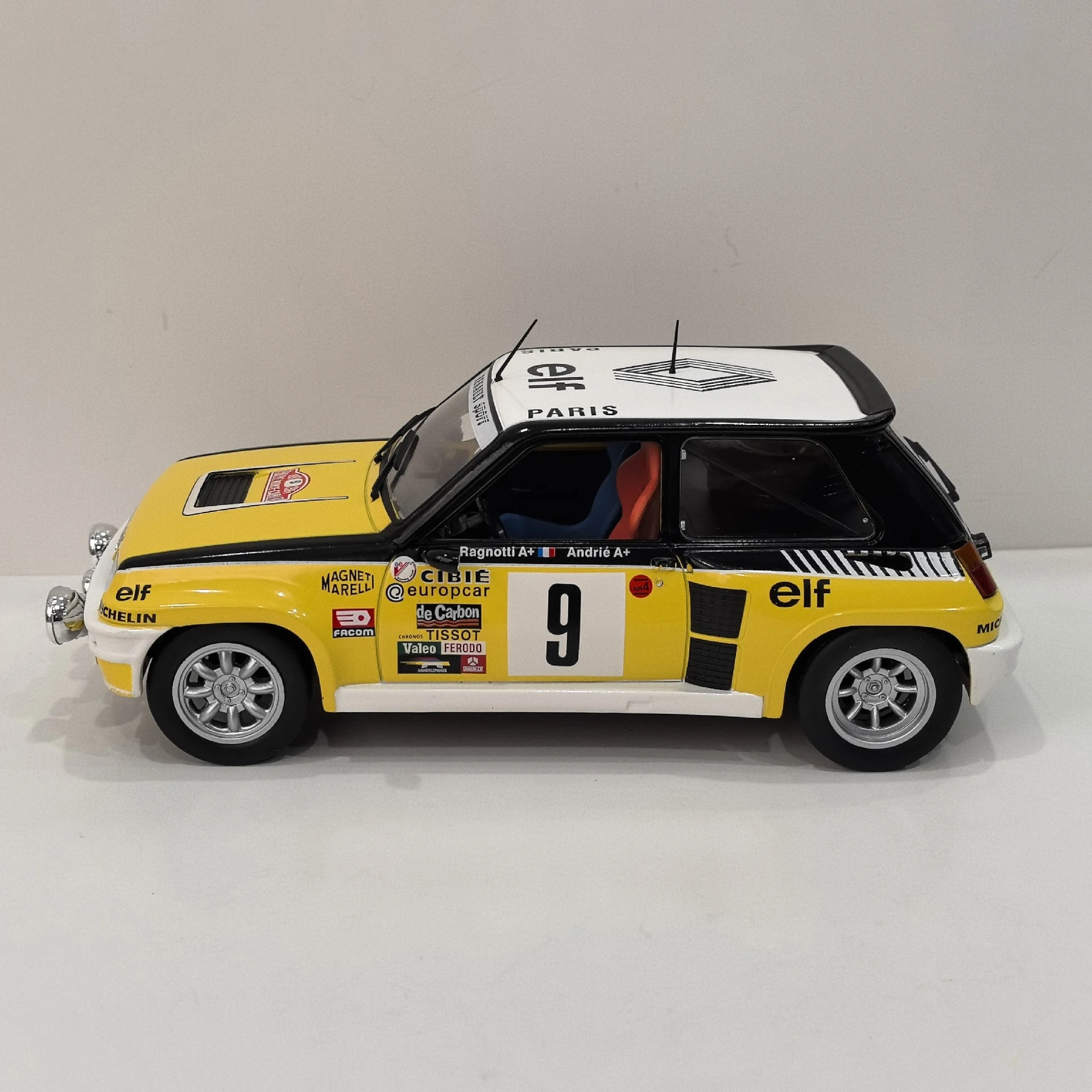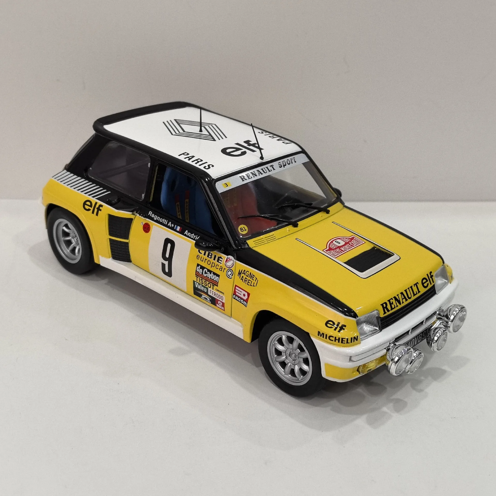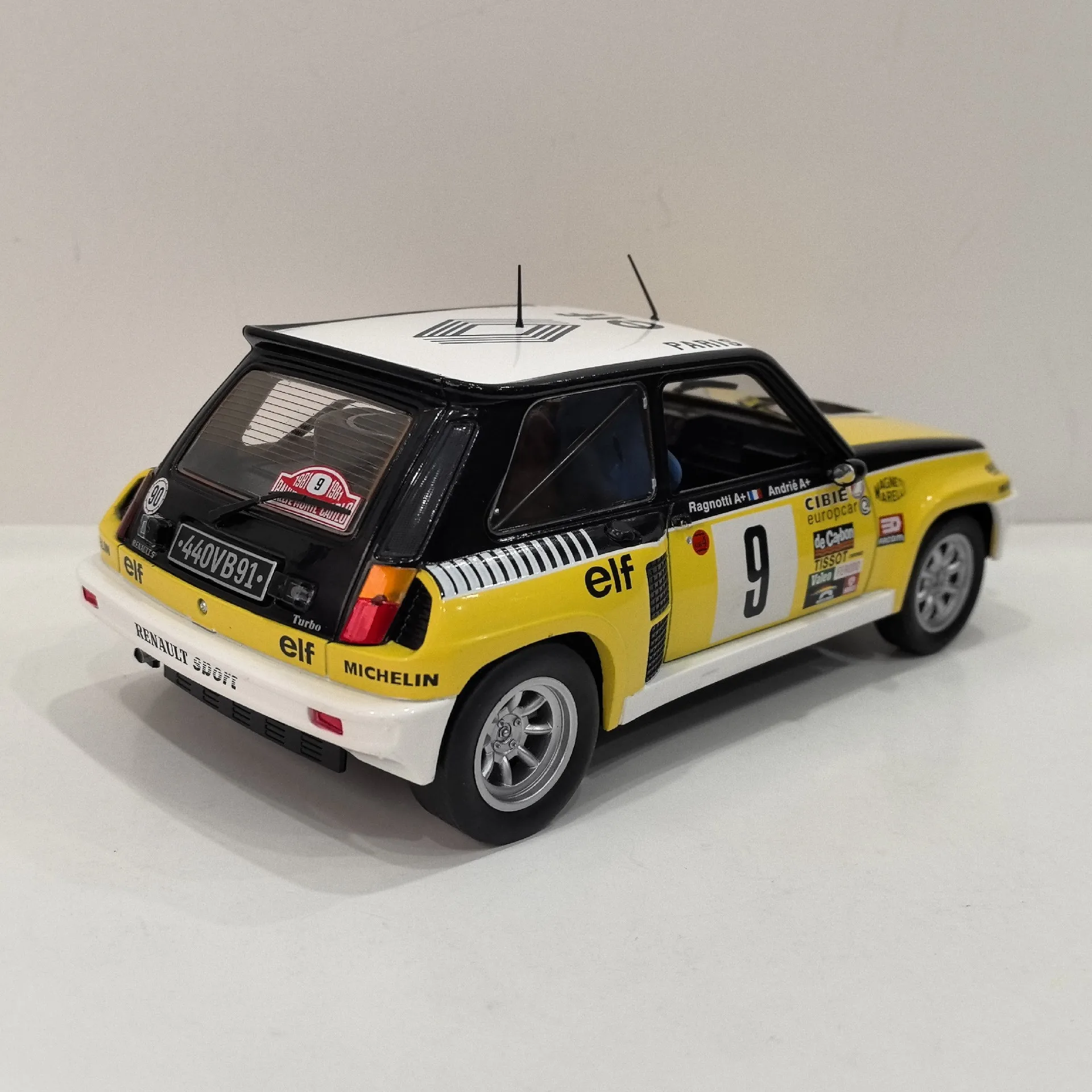 This highly detailed 1:18 scale diecast alloy model of the Renault 5 Turbo #9 captures the vibrant yellow body with bold black accents, realistic decals, and functional opening front doors. The silver wheels feature intricate tread patterns, while the fixed hood and trunk add authenticity. Built from durable metal, it is a non-electric collectible designed for adult enthusiasts. Perfect for display or long-term collection, this finished model conforms to safety standards and features a high-quality construction that showcases the sporty rally aesthetic. An ideal addition for any car collector seeking an accurate and visually striking miniature replica.