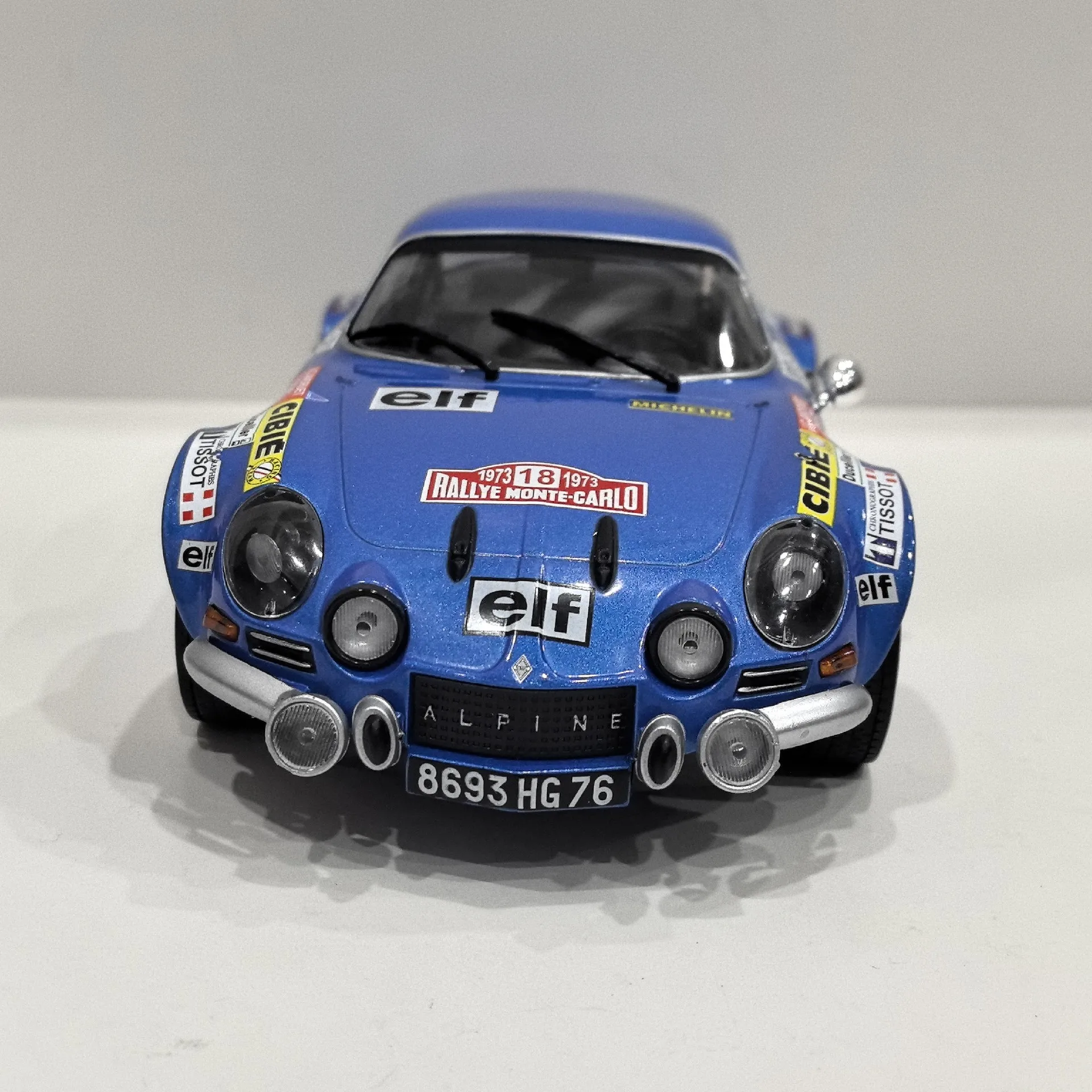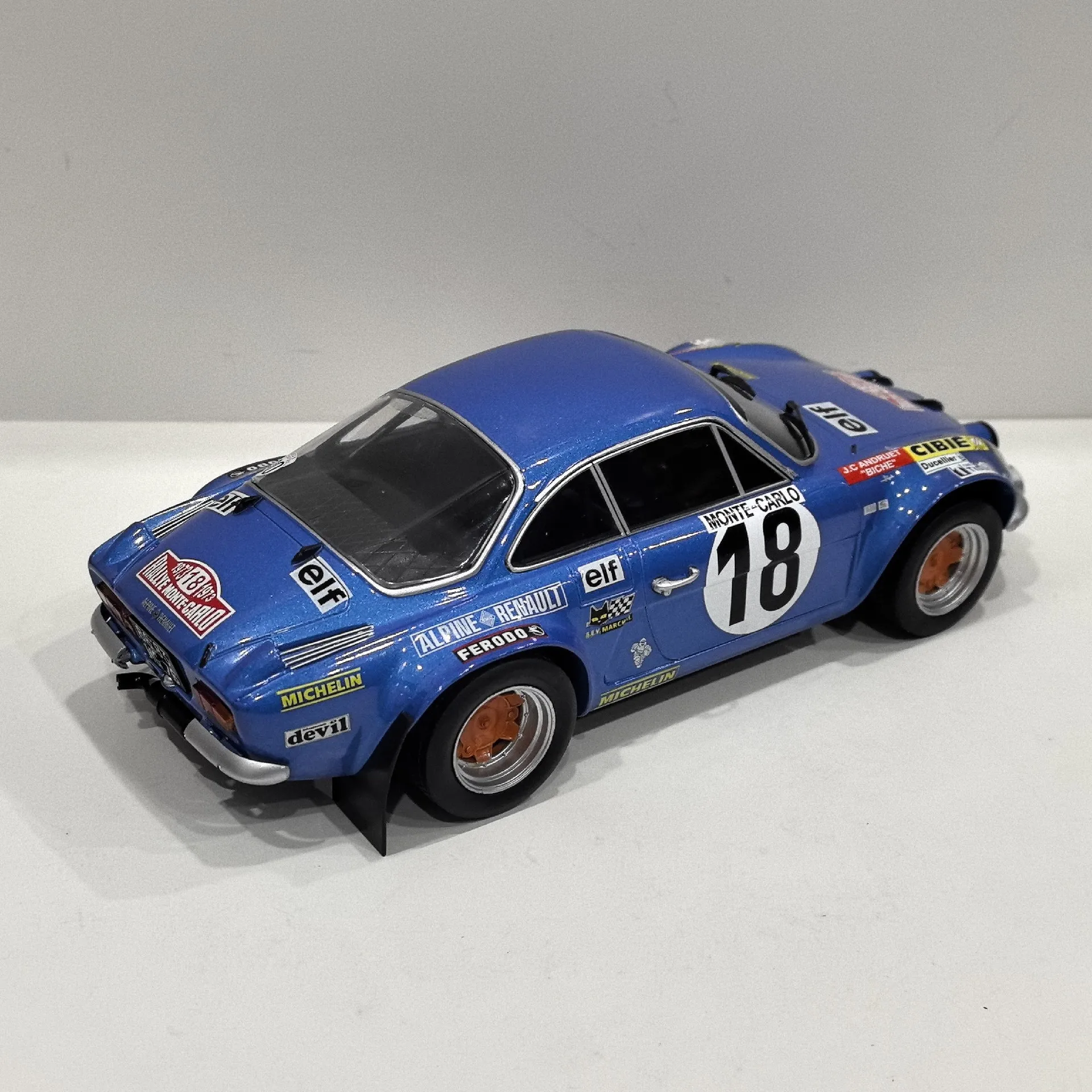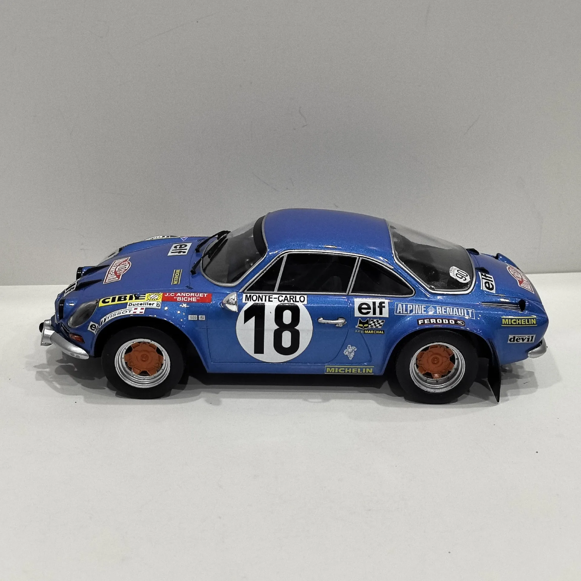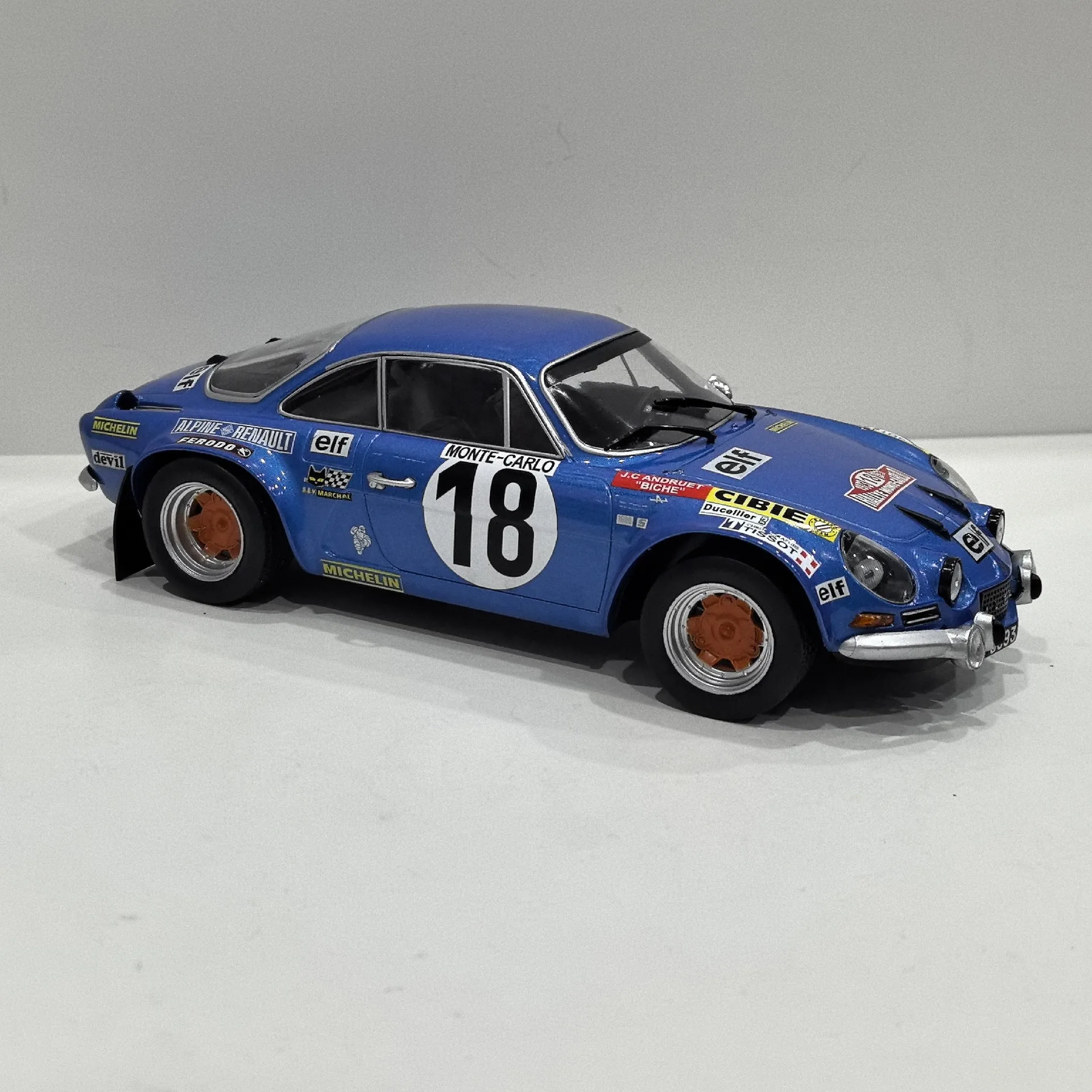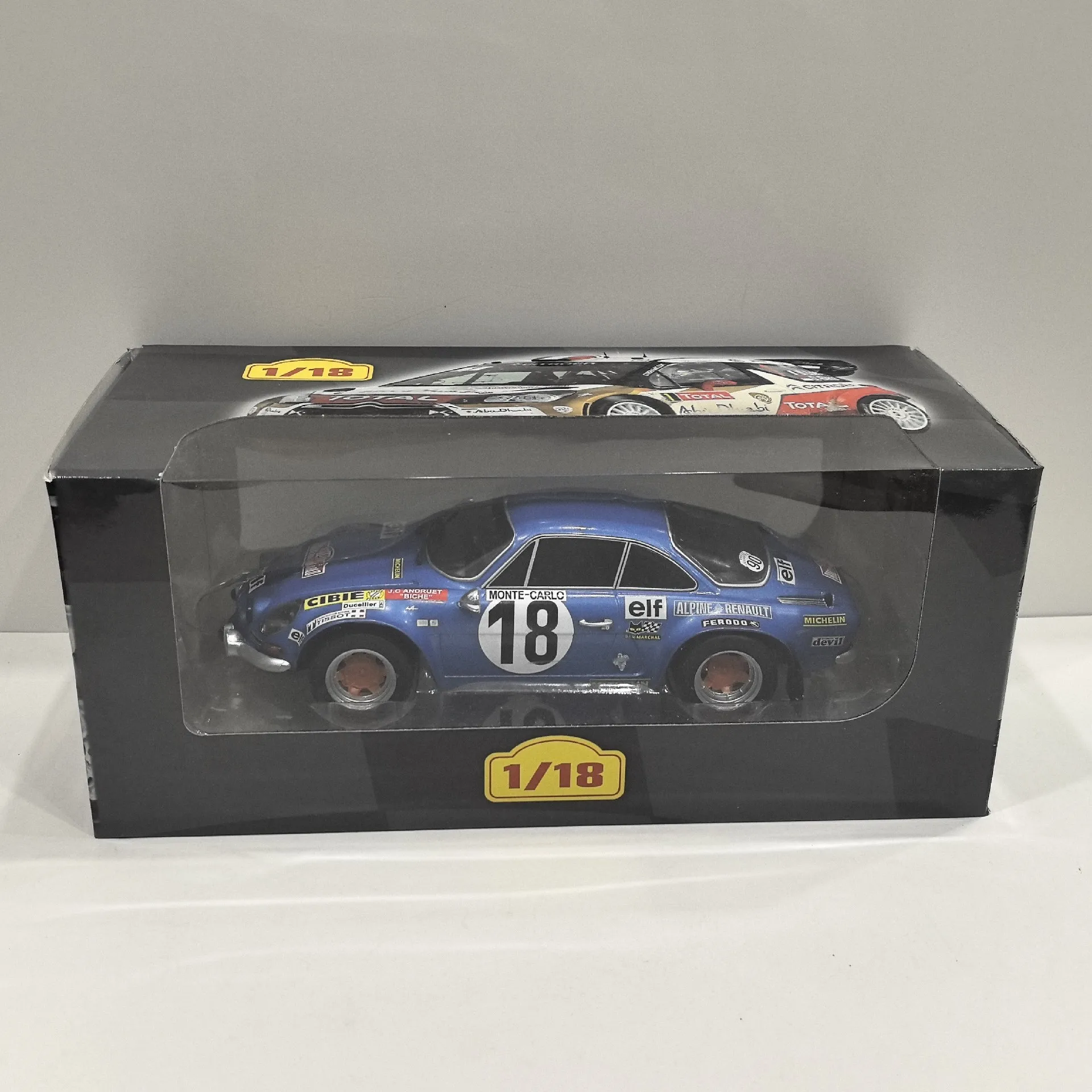 - Meticulously crafted 1:18 scale model made of alloy, accurately replicating the Renault Alpine A110 #18 rally car with vibrant blue paint and detailed decals.