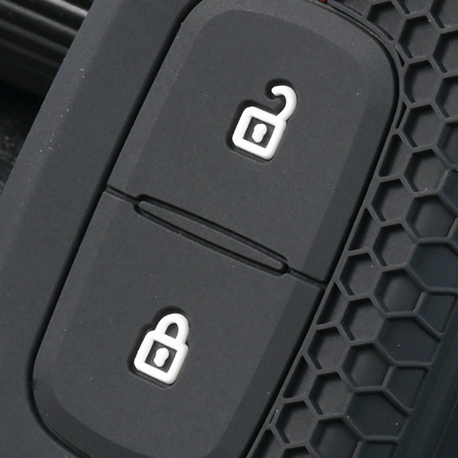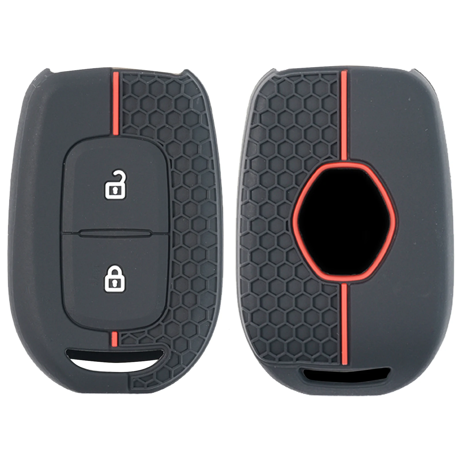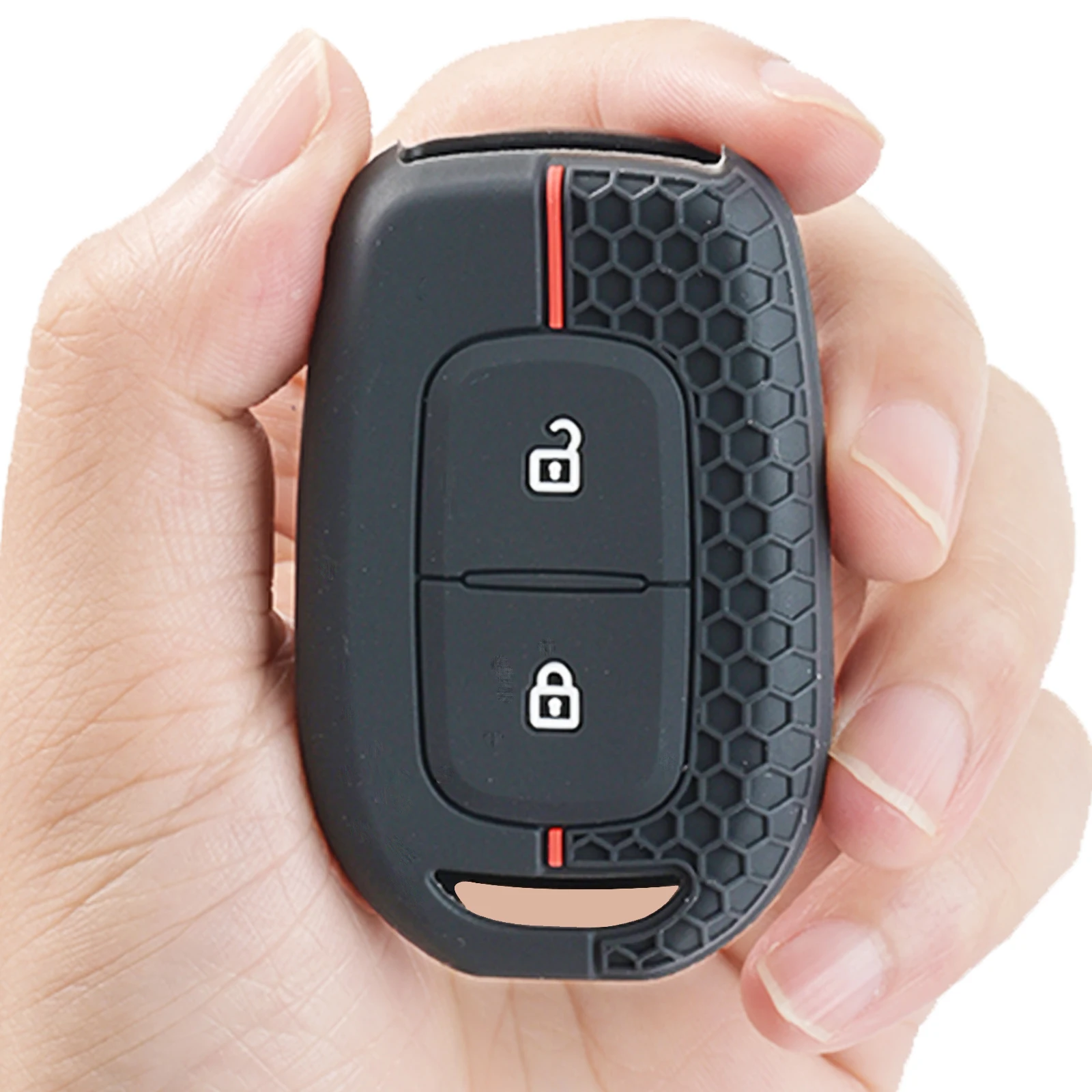 This sleek and stylish 2 Button Silicone Key Ring Case Cover Shell Holder is perfect for your Renault or Dacia vehicle, featuring a predominantly black design with a textured honeycomb pattern that enhances your grip. The prominent red accent line adds a modern touch, making it visually appealing. Crafted from high-quality, food-grade silicone, this case is odorless, non-toxic, and designed for durability, ensuring a snug fit for keys from models like the Renault Logan, Duster, and Clio. With easy cleaning and installation, this key case transforms how you protect your car keys while looking great.