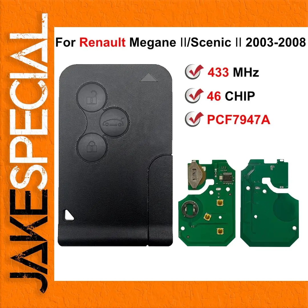 Experience the convenience and reliability of this remote car key, designed specifically for Renault Megane II, Scenic II, and Grand Scenic II models from 2003 to 2008. Featuring a matte black plastic casing with a textured finish, this key ensures a secure grip. Its three distinct buttons—car silhouette, lock, and unlock—are ergonomically designed for effortless operation. With an internal layout that includes a vibrant green circuit board, your key maintains both functionality and aesthetic appeal. This remote key integrates a PCF7947 / HITAG 2 / 46 chip, operating at a frequency of 433 MHz, making it the perfect replacement for your original key.