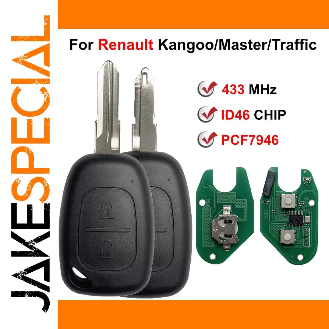 Experience seamless access to your Renault vehicle with this 433 MHz ID46 Chip PCF7946 Remote Car Key Fob. Specifically designed to fit Renault Kangoo, Master, Traffic, Moveano, and Vivaro models, this key fob combines both functionality and style. The smooth black plastic exterior offers an ergonomic design that fits perfectly in your hand. Featuring two essential buttons for locking and unlocking your vehicle, coupled with a securely attached metal key blade, it promises effortless operation. Confidently drive your Renault knowing you have a high-quality key fob tailored just for you.
