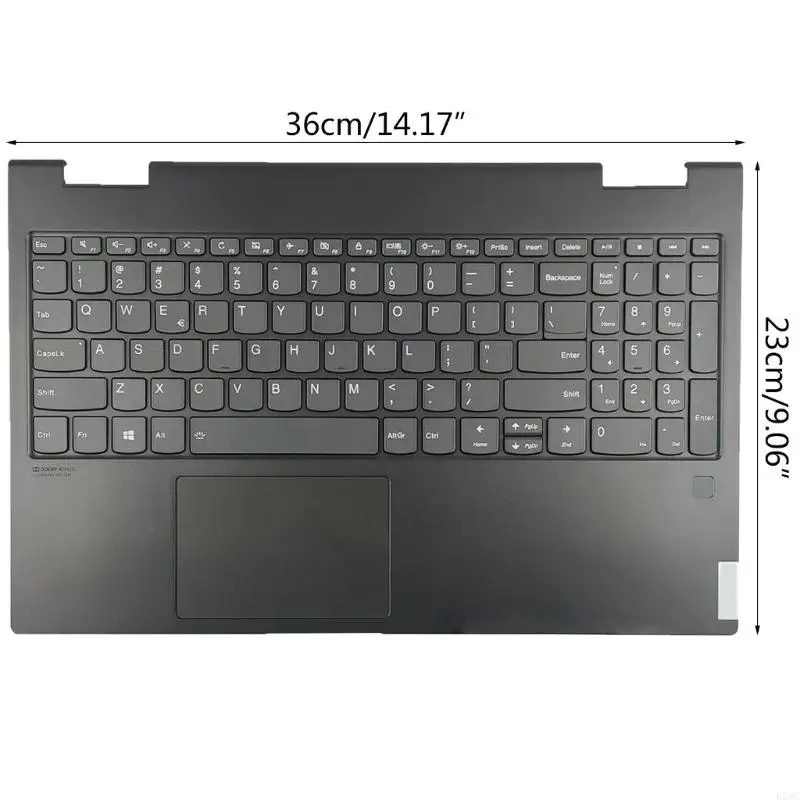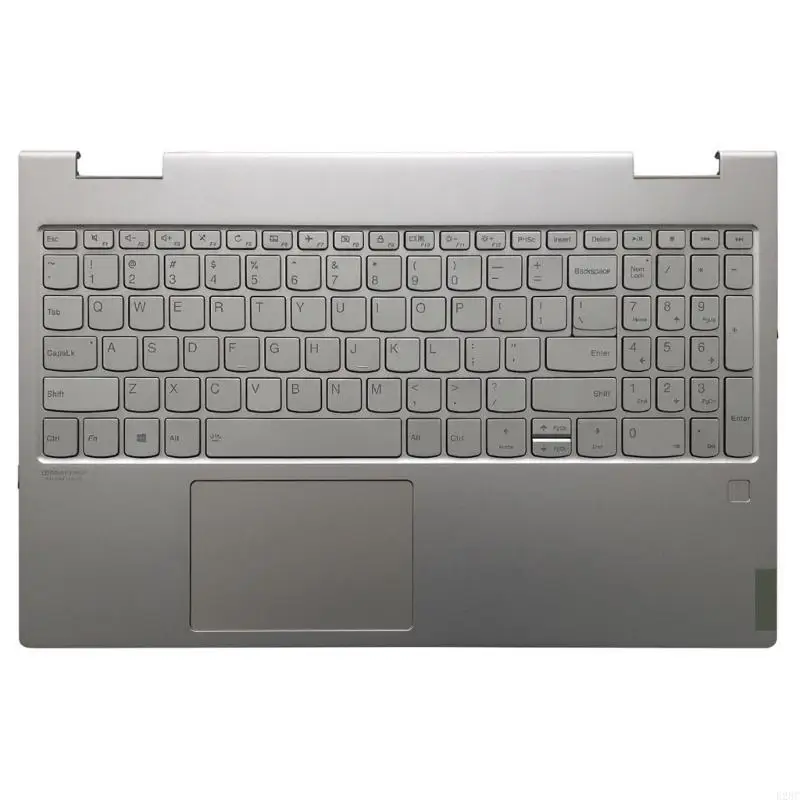 The replacement upper case palmrest keyboard and touchpad assembly is designed specifically for the Lenovo Yoga C740-15IML model. This unit features a modern metallic silver finish that not only enhances aesthetics but also provides durability. The assembly includes a full US layout keyboard, highlighted by light gray keys with darker lettering, ensuring ease of use. The slim profile and flat, square-shaped keys contribute to a contemporary design. Additionally, the touchpad area, also in silver, offers a smooth surface for effortless navigation. With dimensions of approximately 36 cm in width, 23 cm in depth, and a height of 1 cm, this palmrest assembly is essential for upgrading or repairing your laptop.