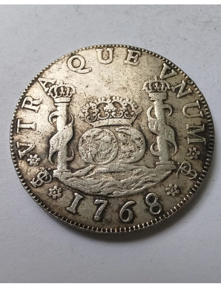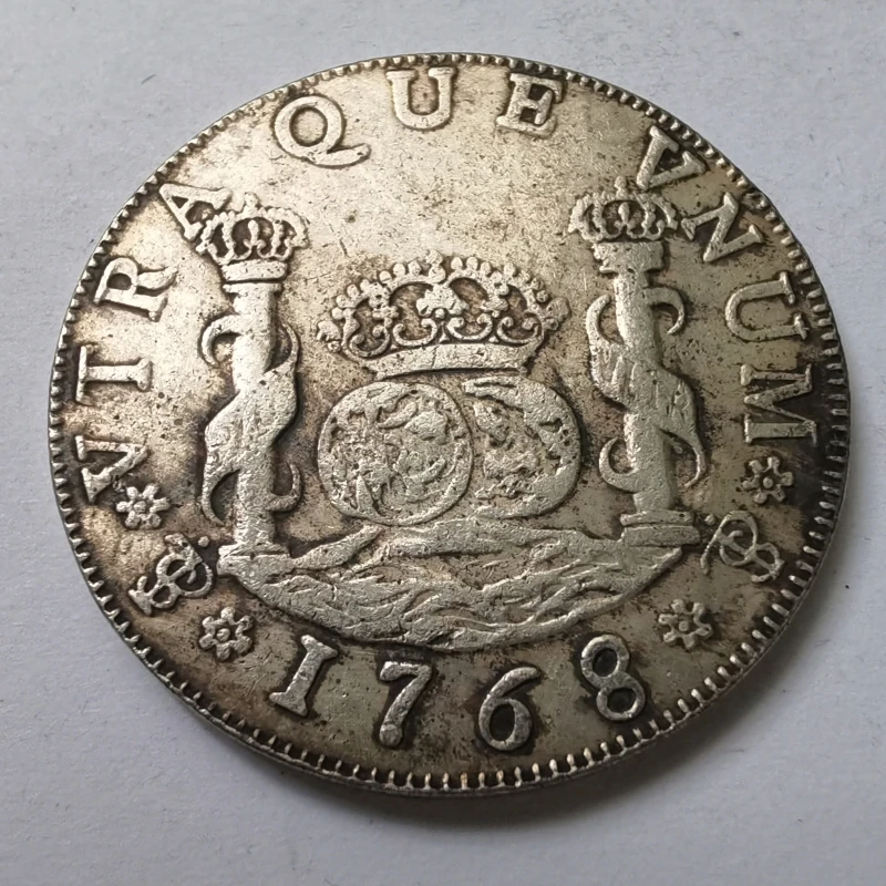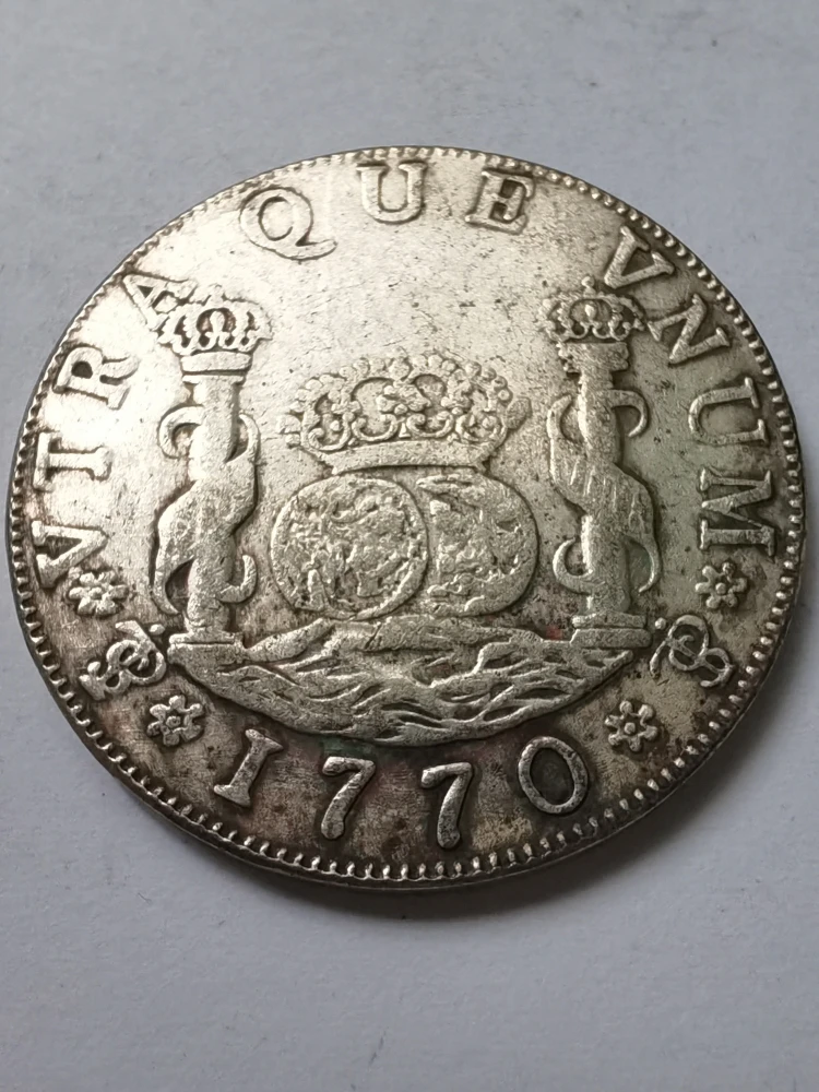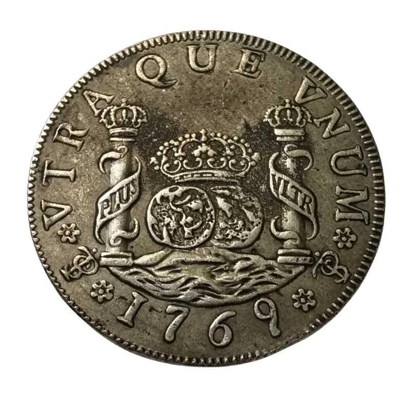Step into history with this stunning replica of the Bolivia 4 Reales coin from the era of Carlos III, dating between 1767 and 1770. Crafted with meticulous attention to detail, this coin features an antique European style, showcasing a worn, tarnished metallic finish that mimics the aged appearance of historic currency. The coin’s textured surface highlights the craftsmanship, including an ornate coat of arms at the center with heraldic lions and castles, encased in a detailed frame with a regal crown on top. Its classic ridged edges and vintage design evoke a sense of historical authenticity, making it an ideal collector's piece or decorative artifact. Available in four different years, this coin brings a touch of royal heritage to your collection or display. Own a piece of history today!