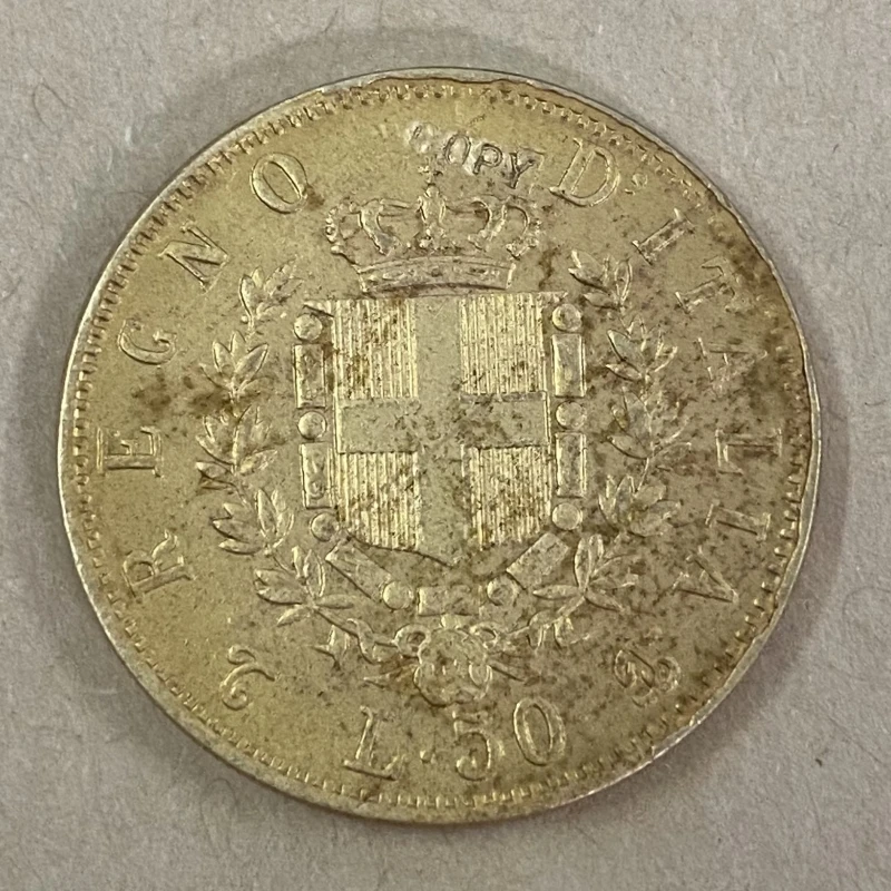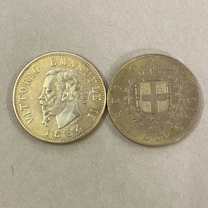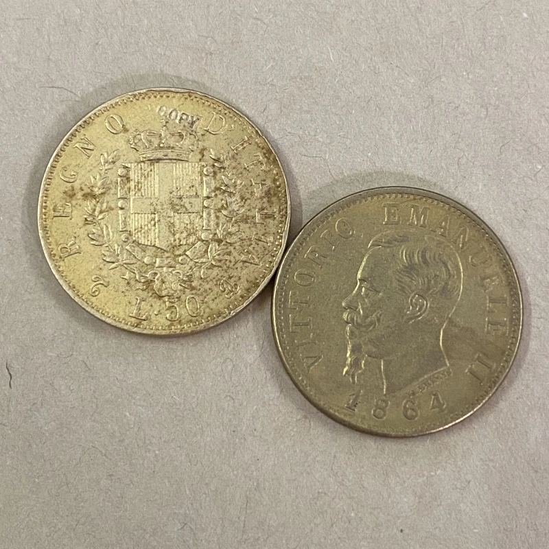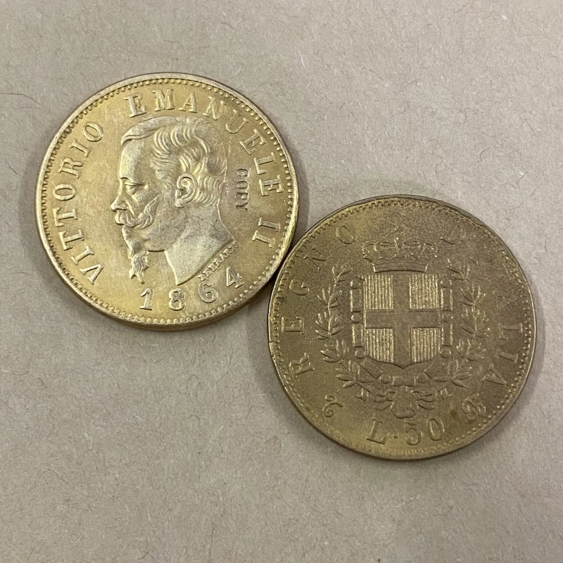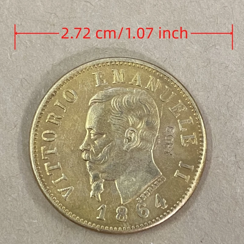 Experience the vintage charm of a 19th-century European coin with this replica 1864 Italy 50 Lire featuring Victor Emmanuel II. Made of copper with a warm, golden hue, it showcases intricate details including a histórico portrait with a dotted border and a heraldic shield topped with a crown, surrounded by a laurel wreath. Crafted using casting techniques, the coin exudes a nostalgic, antique aesthetic reminiscent of old European currency and furniture. Perfect for collectors and enthusiasts, this decorative novelty piece captures the timeless elegance of the 1860-1879 era, offering a nostalgic touch to your collection or home decor.