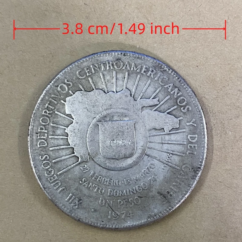 Bring a touch of history and nostalgia to your collection with this replica 1-piece coin from the Dominican Republic, dated 1974. Crafted with copper and featuring detailed casting a vintage design, this coin commemorates the 100th anniversary of the Central American and Caribbean Games. Its intricate design showcases the national coat of arms, the year, and special markings reflecting the sports event. Perfect for display or收藏, this coin enables you to connect with a significant moment in Caribbean history. Imagine yourself holding a piece of the past—adding this unique item to your collection enriches your appreciation of regional heritage and antique craftsmanship.