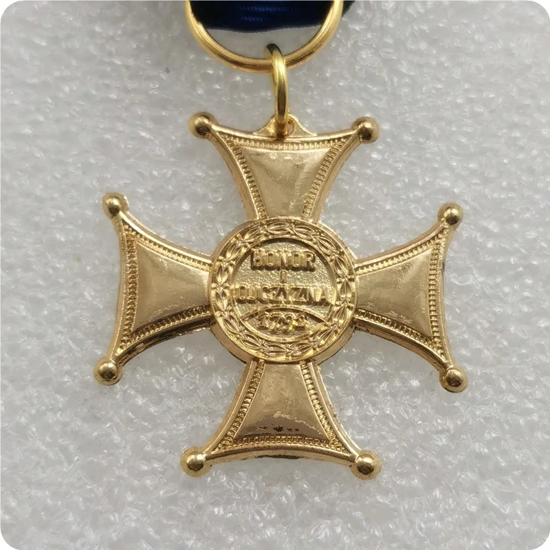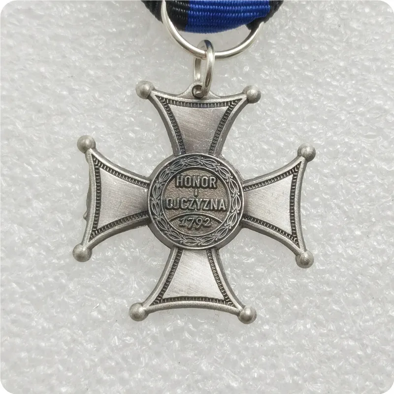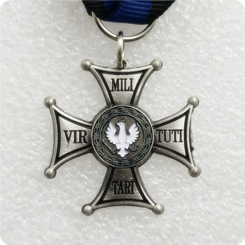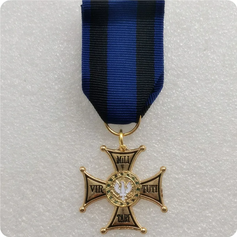 Imagine adding a distinguished piece to your collection with this beautifully crafted replica of the Order of Virtuti Militari. This medal features an intricate, vintage design that exudes historic charm, perfect for collectors and enthusiasts seeking a noble aesthetic. Made of high-quality metal with an aged, patinated finish, it mimics the appearance of antique silver or gold, adding depth and authenticity. The cross-shaped medal boasts four rounded, convex arms engraved with Latin inscriptions, centered by a detailed eagle with outstretched wings, symbolizing patriotism and military valor. The attached ribbon, with its classic royal blue and black stripes, completes the authentic look. This collectible piece is ideal for display or investment in historical memorabilia.