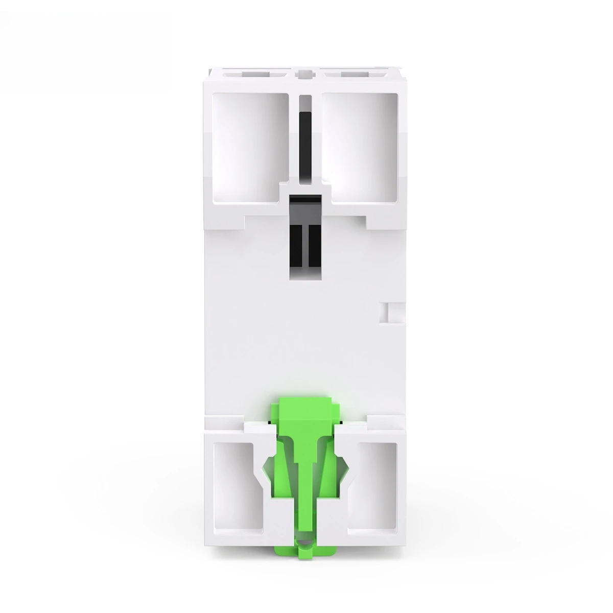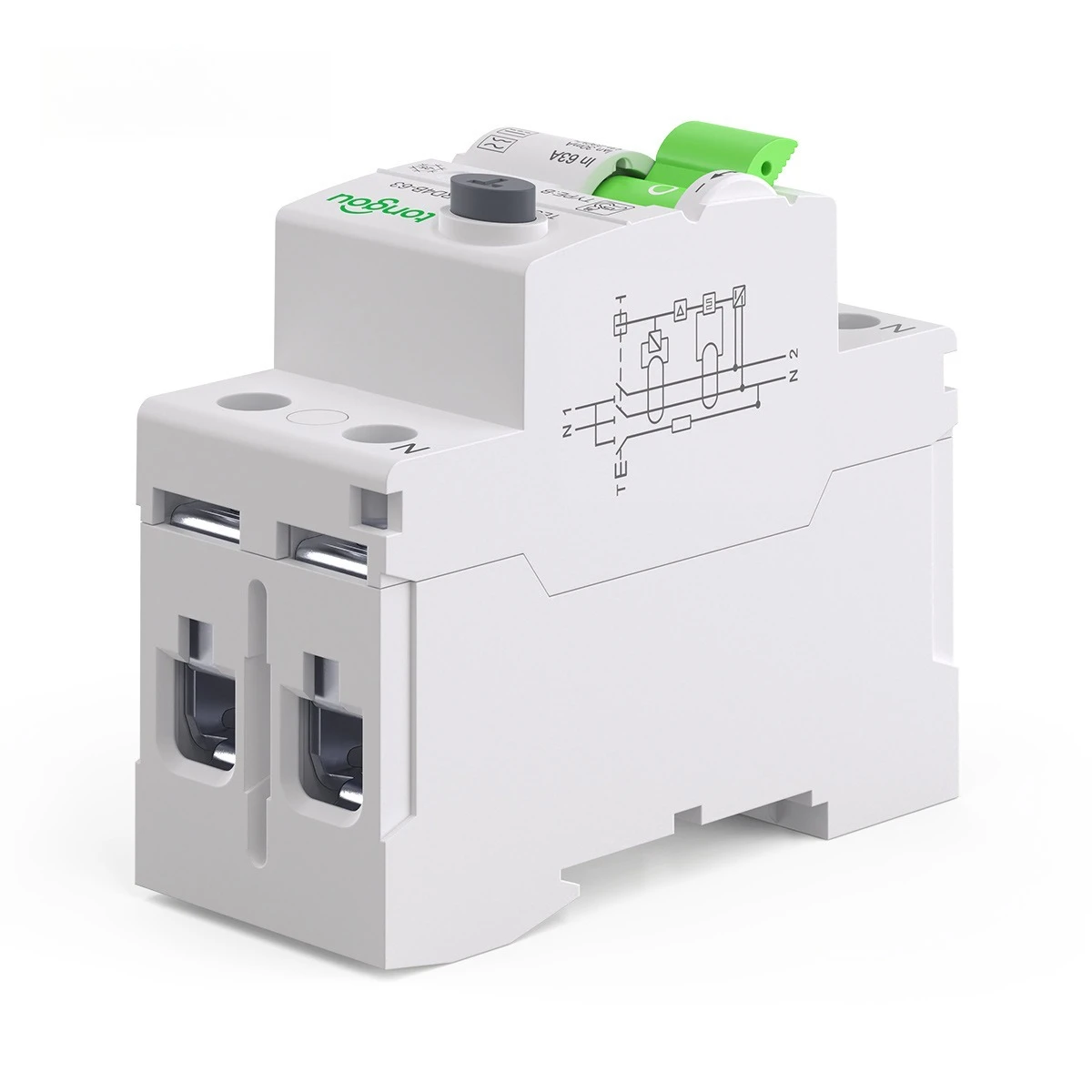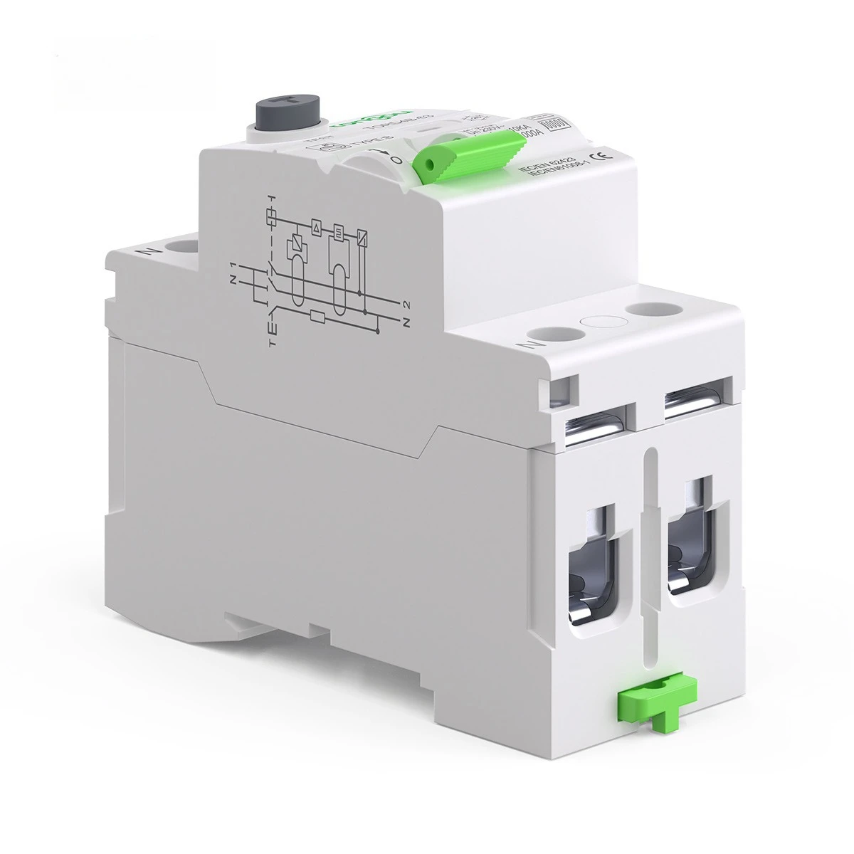 Imagine confidently managing your electrical system with this sleek, modern residual current circuit breaker. Its clean, white, rectangular design seamlessly fits into your EV charger or solar setup, ensuring safety and peace of mind. The prominently positioned, rounded green switch provides a clear visual cue for operation, while the test button offers simple functionality checks. Technical details are subtly printed in black, maintaining a professional look. Built for durability, this device features visible terminal connections secured with precise screw terminals, ready for seamless wiring. Its compact form allows for easy installation, and its versatile rated current options make it suitable for various electrical loads, whether in your home or commercial solar and EV charging setup. Trust this device to protect your investment.