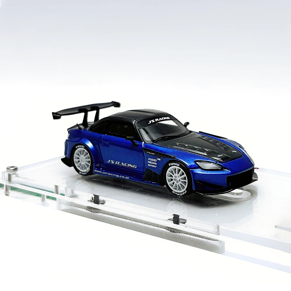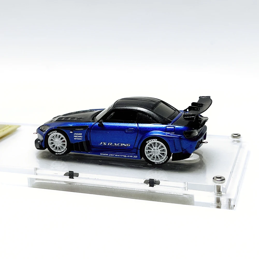 This 1:64 scale resin model captures a sleek S2000 sports car with a full enclosure, featuring vibrant blue paint accented with black details on the hood, roof, and rear wing. Detailed vents, subtle panel lines, and crisply molded headlights enhance its realism. The white multi-spoke wheels with low-profile tires and a prominent black spoiler complete its high-performance racing aesthetic. Transparent windows reveal a detailed interior, making it a perfect collectible for enthusiasts. Crafted from resin, plastic, and rubber, this static display piece is housed in a dustproof box and designed for display, gifting, or hobbies, with minor paint imperfections typical of resin models. Suitable for ages 14 and up.
