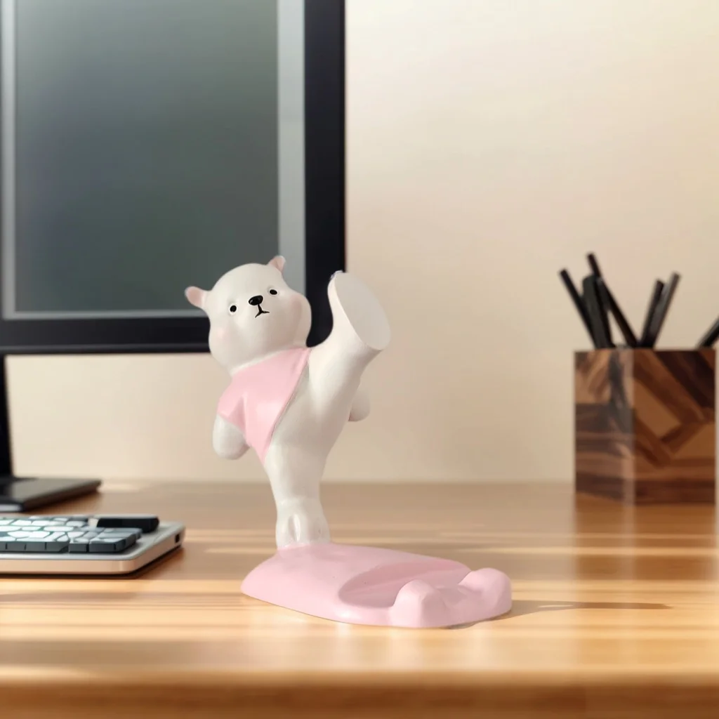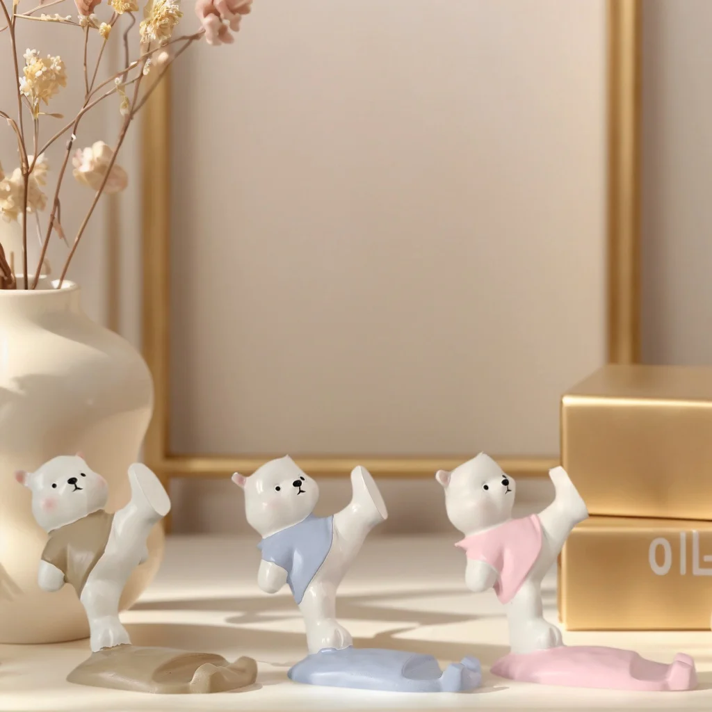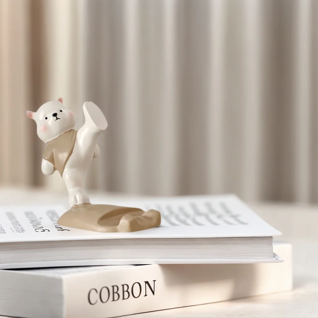 Imagine adding a touch of adorable charm to your space with this beautifully crafted resin bear figurine. Designed with a playful pose, the bear balances on one leg while lifting the other high, creating a lively and joyful atmosphere. Its soft, smooth surface shines with a glossy finish, highlighting minimalist details like tiny black eyes, a small black nose, and a gentle smile — all contributing to its friendly and approachable look. The bear wears a light blue vest that adds a subtle splash of color, making it stand out against its white body. With its modern animal theme, this decorative piece is perfect for relaxing environments or to add warmth to your desk or shelf. It creates a fun, supportive space for your mobile device while enhancing your decor.