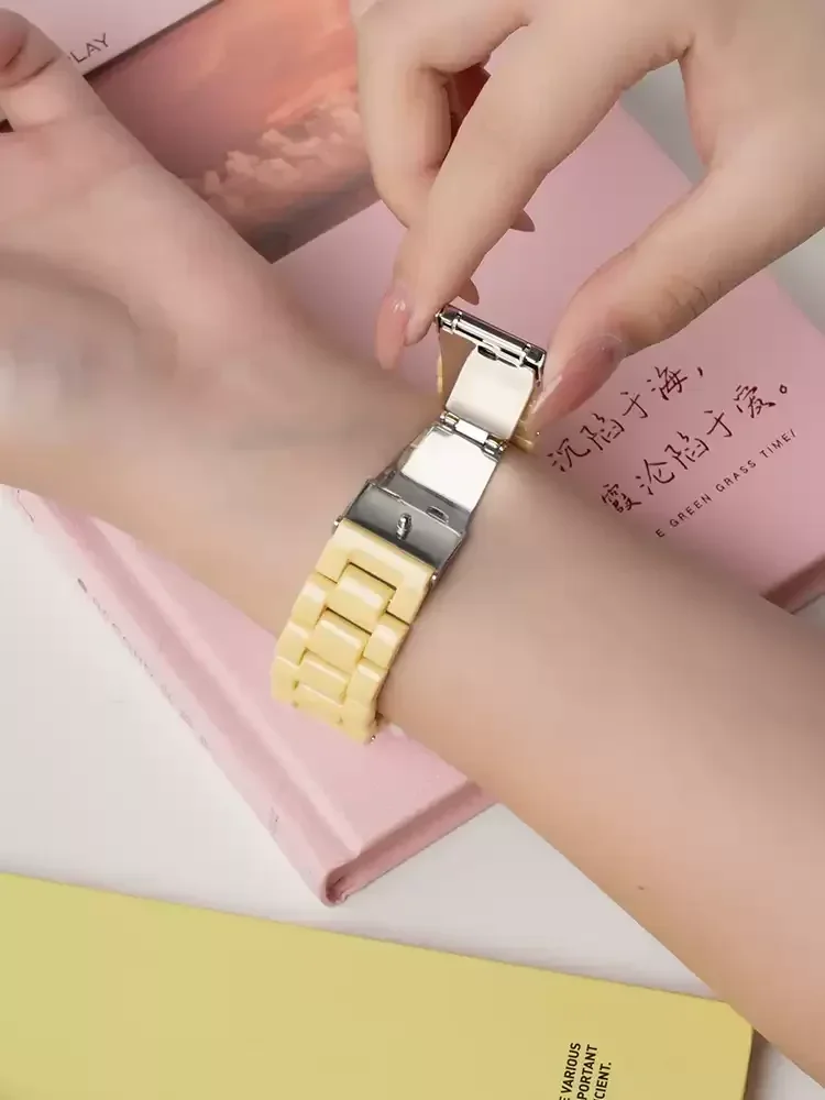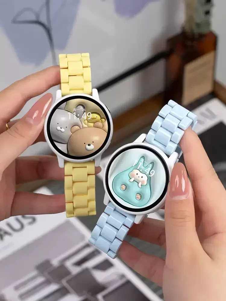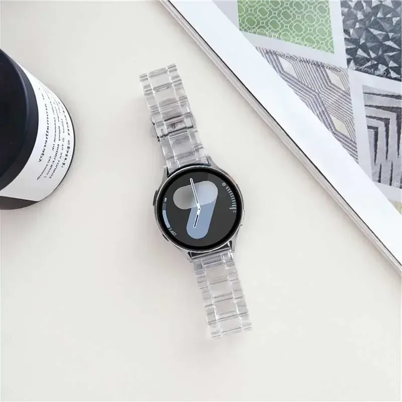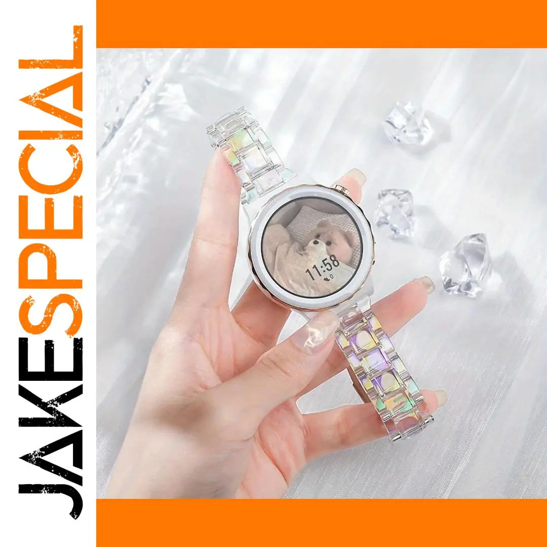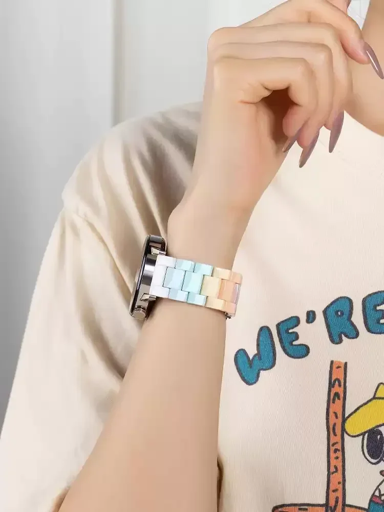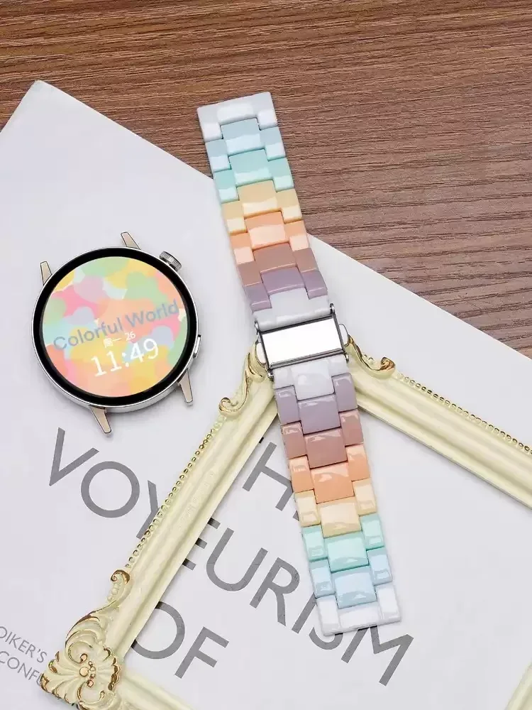 Enhance your smartwatch style with this durable resin strap, available in 20mm and 22mm widths, featuring a sleek, segmented design with a glossy, iridescent finish in colors like midnight blue, pink, pine green, white, black, and transparent. Compatible with a wide range of devices including Samsung Galaxy Watch series, Amazfit GTS, Xiaomi Mi Watch Lite, Garmin Vivoactive, Forerunner models, Huawei Watch GT, and other standard watches with 20mm or 22mm lug widths. Crafted from high-quality resin, it offers a modern, unisex look, and requires an adjustment tool for a perfect fit. Sold new with tags, this strap adds a trendy, youthful touch to your timepiece.