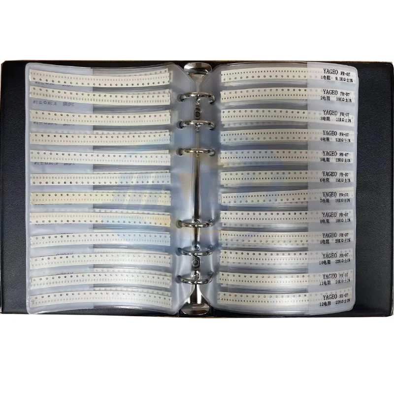 This professional resistor book kit features a sleek black rectangular design with a textured surface, accented by gold-colored Chinese characters and the English label “Sample Book” on the front. It includes models in sizes 0201, 0402, 0603, 0805, and 1206, with 170 values per size, available in quantities of 50 or 25 pieces. The resistors range from 0Ω to 10MΩ with a ±1% tolerance, perfect for surface-mount applications. Designed for precision and versatility, this collection offers a clean, minimal aesthetic, making it an essential resource for electronics enthusiasts or professionals seeking reliable, organized resistor storage.