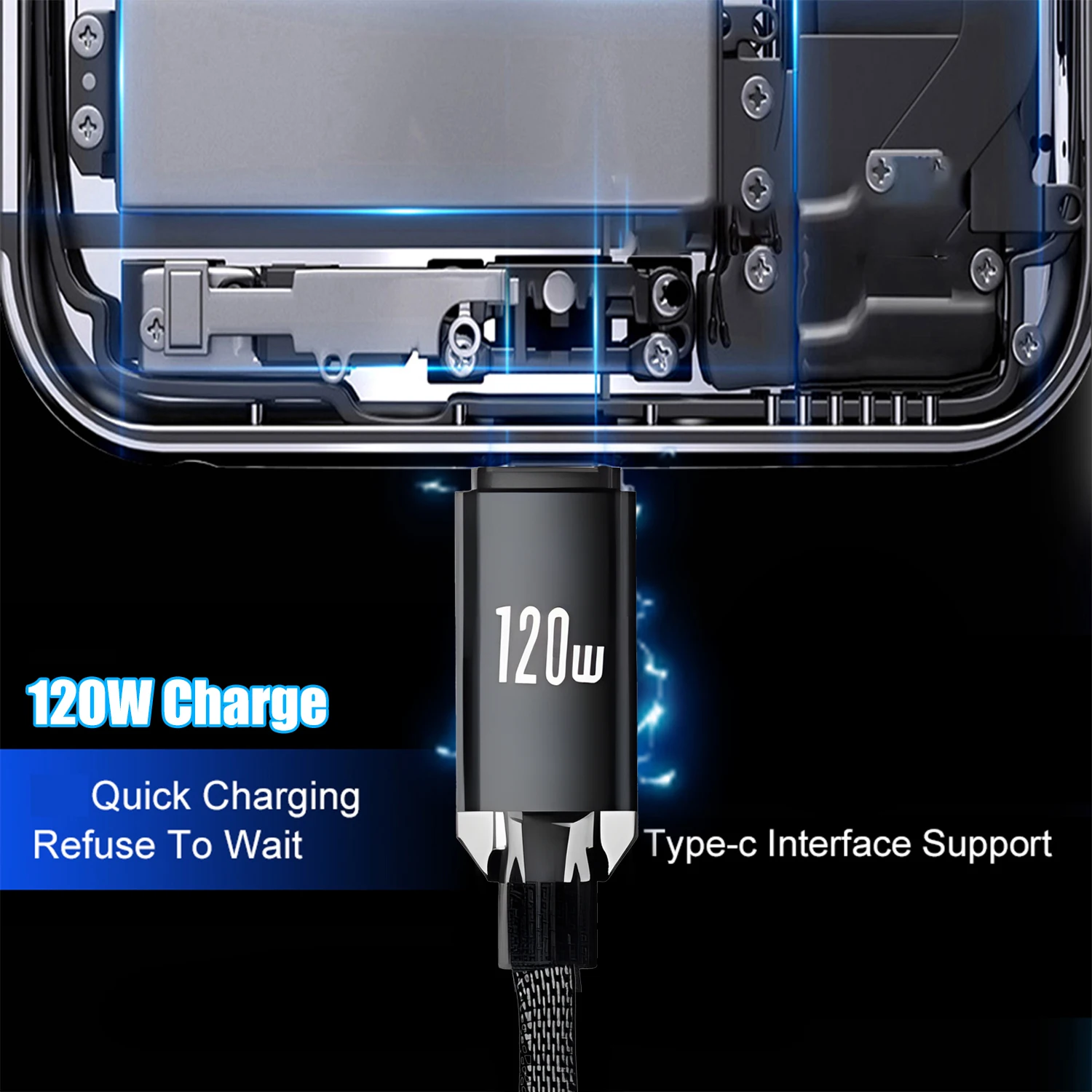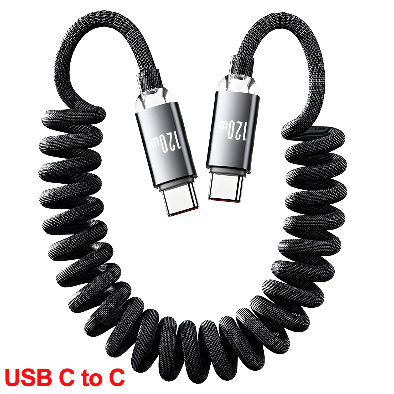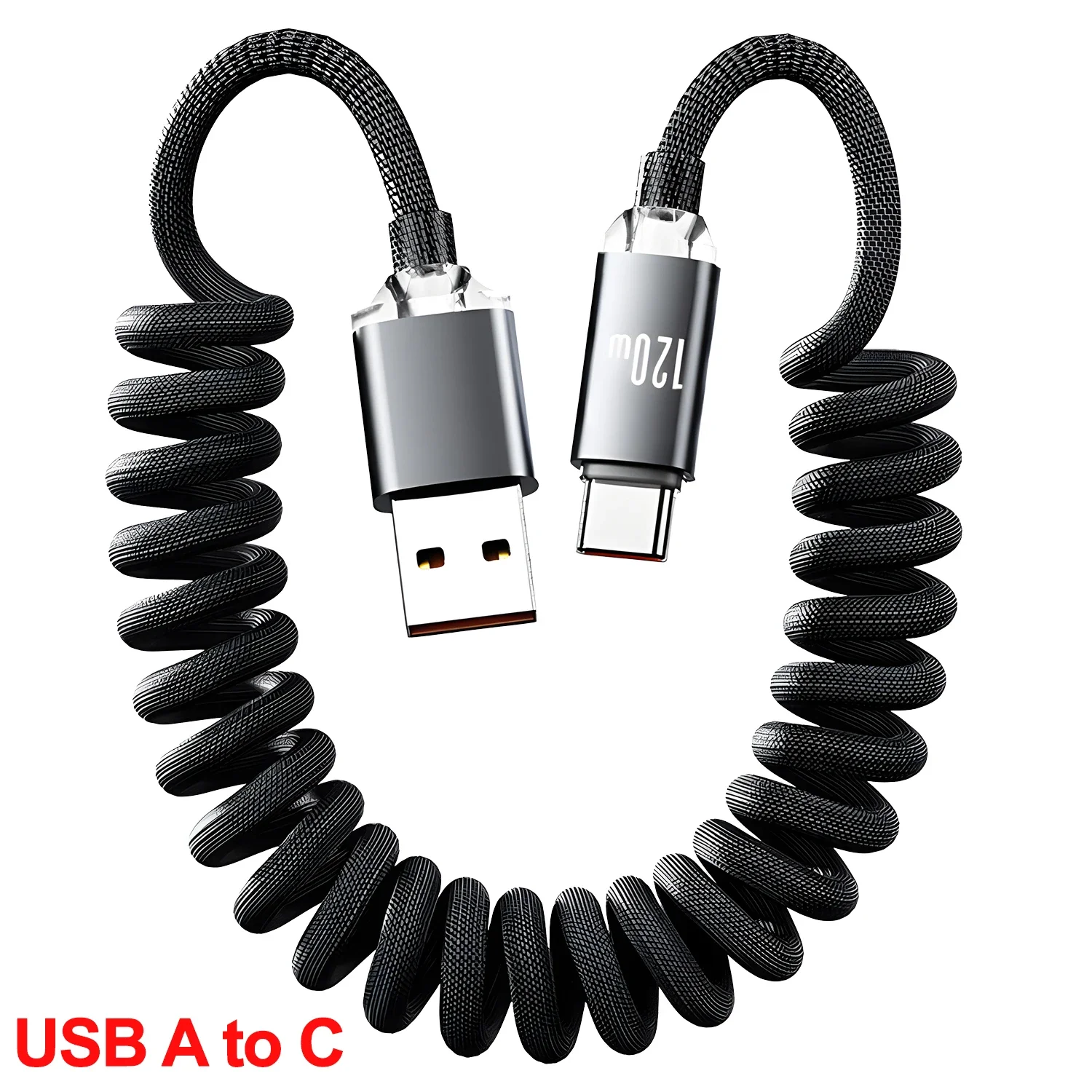 Experience reliable high-speed charging and data transfer with this 120W retractable USB A to Type-C cable, crafted from durable braided nylon and PVC insulation. Designed for maximum current of 5A, it supports fast charging for CarPlay, Mi, and Android devices. Available in black, it comes in 1-meter or 2-meter lengths, featuring sleek metallic housings on both USB Type-C connectors—rectangular for USB A and rounded for Type-C—ensuring a stylish and sturdy connection. Its flexible, stretchable design with neat coils makes it perfect for everyday use, whether at home, in the car, or on the go.
