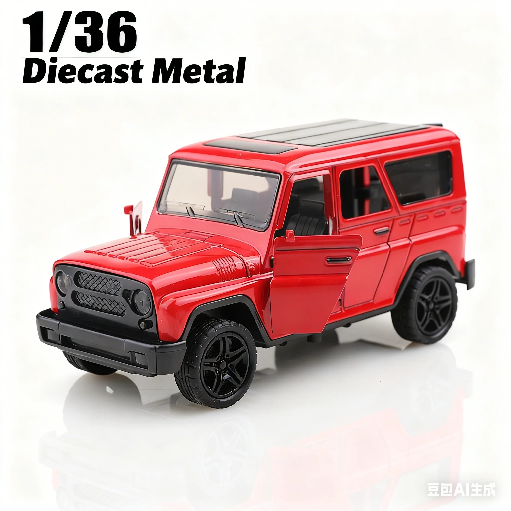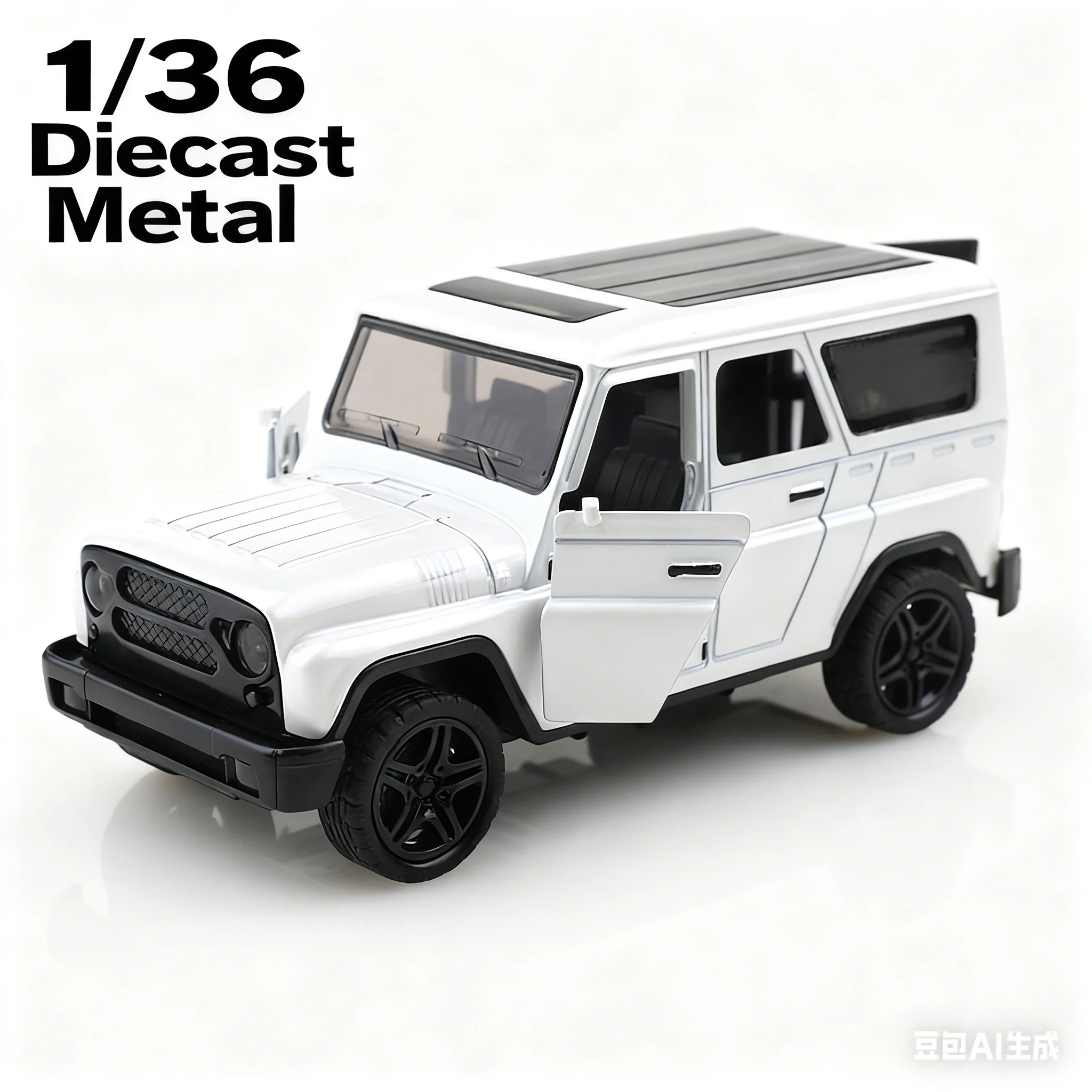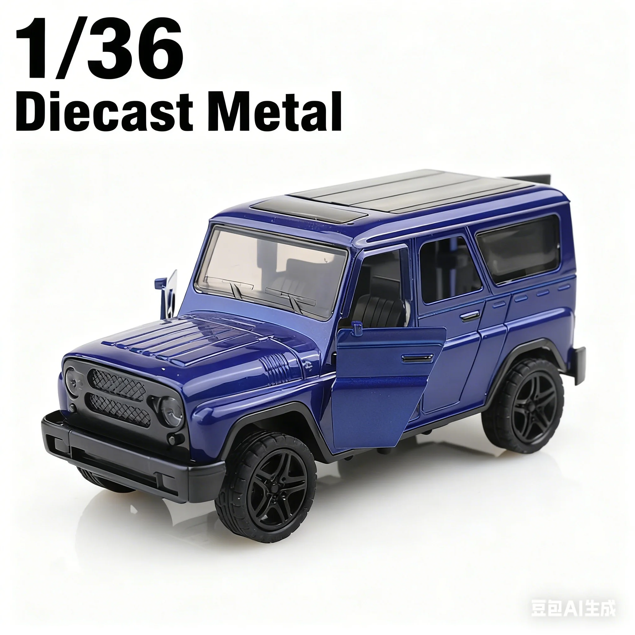 Discover this 1:36 scale retro-style UAZ alloy pullback car, crafted from durable die-cast metal in four vibrant colors: white, blue, red, and black. Its rugged, vintage-inspired design features a boxy shape, rectangular mesh grille, round headlights, and alloy-like rims on black wheels, capturing a nostalgic off-road aesthetic. The car operates via a simple pull-back mechanism, requiring no batteries or electrical components, making it perfect for collectors or enthusiasts aged 4 and above. With its authentic textured finish and minimal exterior details, this model exudes durability and classic charm, adding an eye-catching, nostalgic touch to any collection or display.