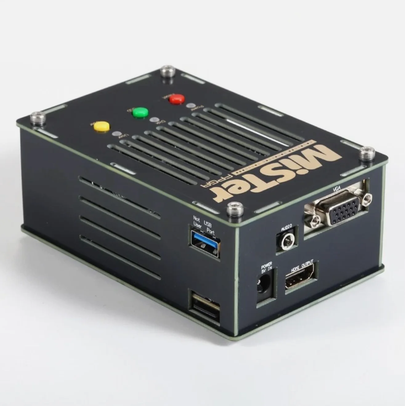 Experience the thrill of classic gaming with this this portable mini game console, crafted for enthusiasts seeking a retro experience in a compact design. Built around a powerful Cyclone V SoC FPGA development board, it features 128MB SDRAM and a Cyclone V 5CSEMA6U23 chip, delivering smooth performance for retro games. Its sleek black case made of durable PCB material offers a modern industrial aesthetic, with vented sections and a bold beige “MiSTer FPGA” logo on top. The console connects easily via a Mini-USB cable and is powered by a 5V DC power supply. With an official IO board, users enjoy VGA output, audio via 3.5mm jack, USB HUB, SNAC, and RTC support, making the device versatile and reliable.