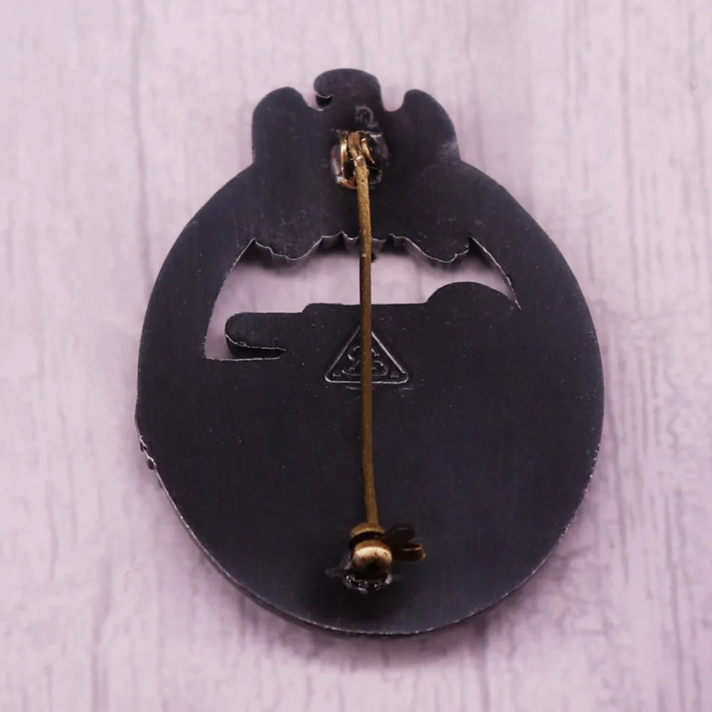 This Retro German 1957 Armoured Tank Panzer Assault Badge Brooch is a striking tribute to military history. Its detailed oval design features a meticulously crafted armored tank at the center, depicting elements reminiscent of the iconic German Panzer. The tank is expertly detailed with a turret, barrel, and treads, evoking a sense of nostalgia. An eagle soars above, reinforcing the piece's commanding aesthetic. Surrounding the brooch is a laurel leaf motif, symbolizing honor and achievement. Finished in a bronze tone, this durable alloy brooch is perfect for jackets, backpacks, or hats. Its unisex appeal makes it an ideal accessory for collectors or enthusiasts of military memorabilia.
