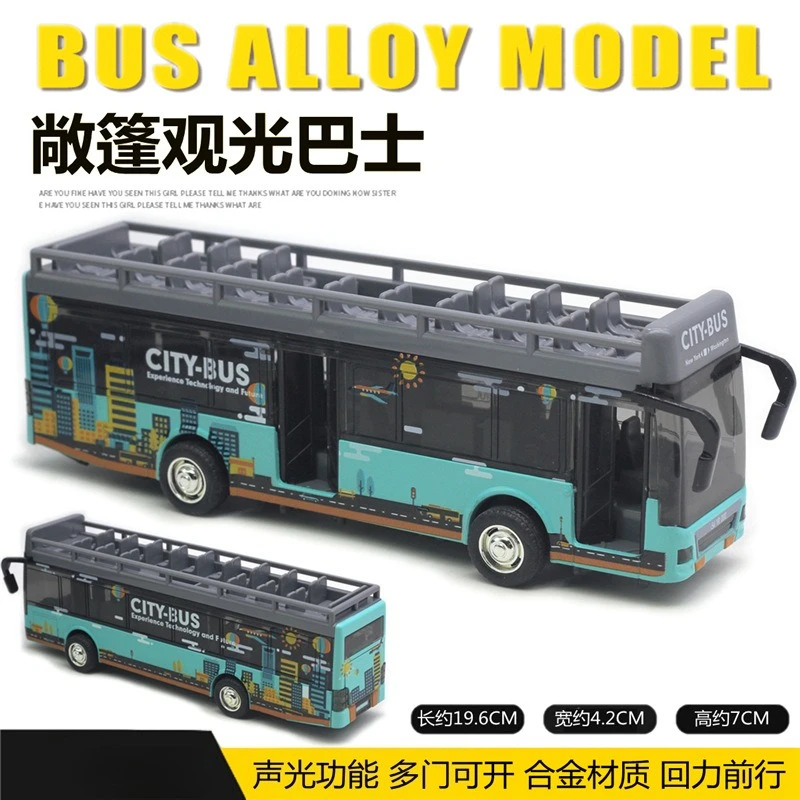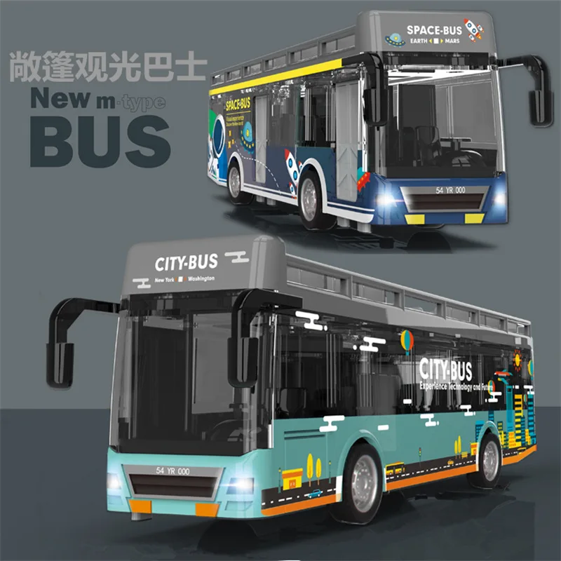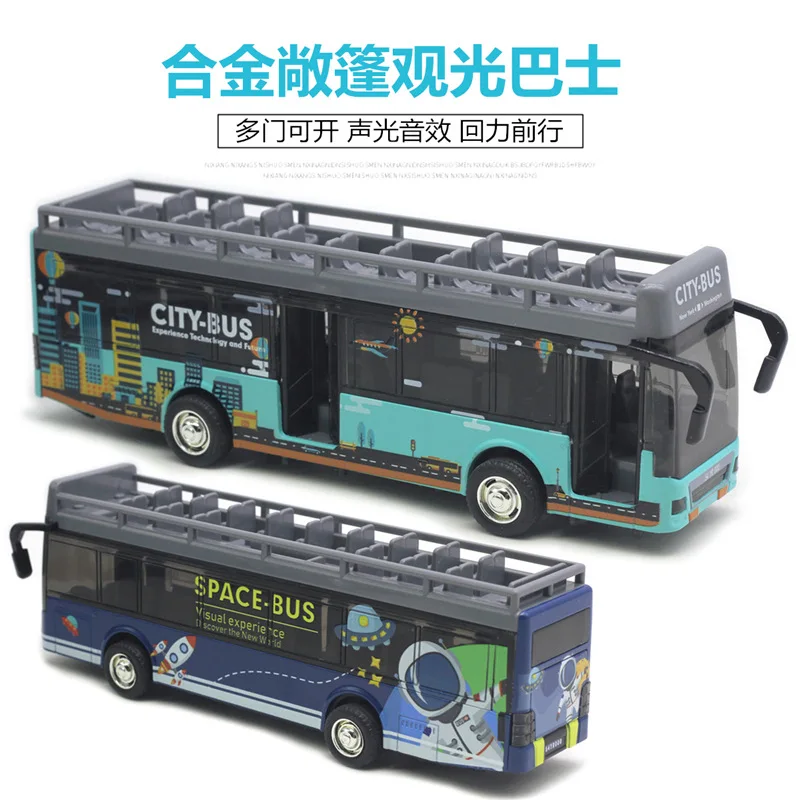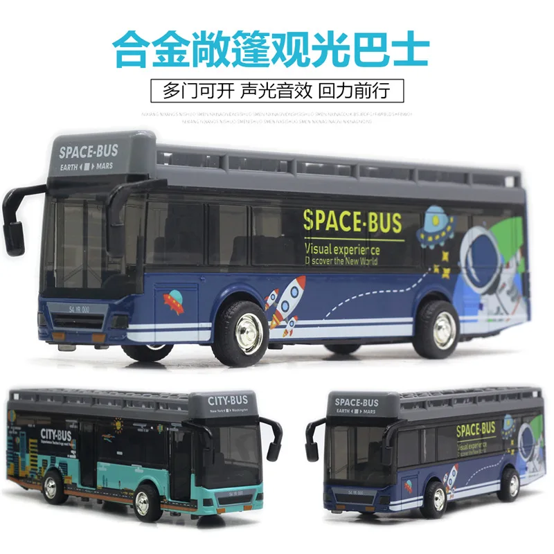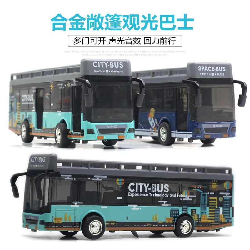 This diecast alloy sightseeing bus model features a vibrant retro graffiti space design with three doors, crafted for collectors and enthusiasts aged 14 and above. Available in dark blue with box, baby blue with box, dark blue no box, and baby blue no box, it showcases bold, colorful artwork of space themes and cityscapes on a smooth, glossy finish. The model has metallic silver wheels with black tires and gray roof racks with open compartments, adding a practical and stylish touch. Its sturdy construction and detailed graphics make it an eye-catching display piece, perfect for adding a playful yet artistic vibe to any collection.