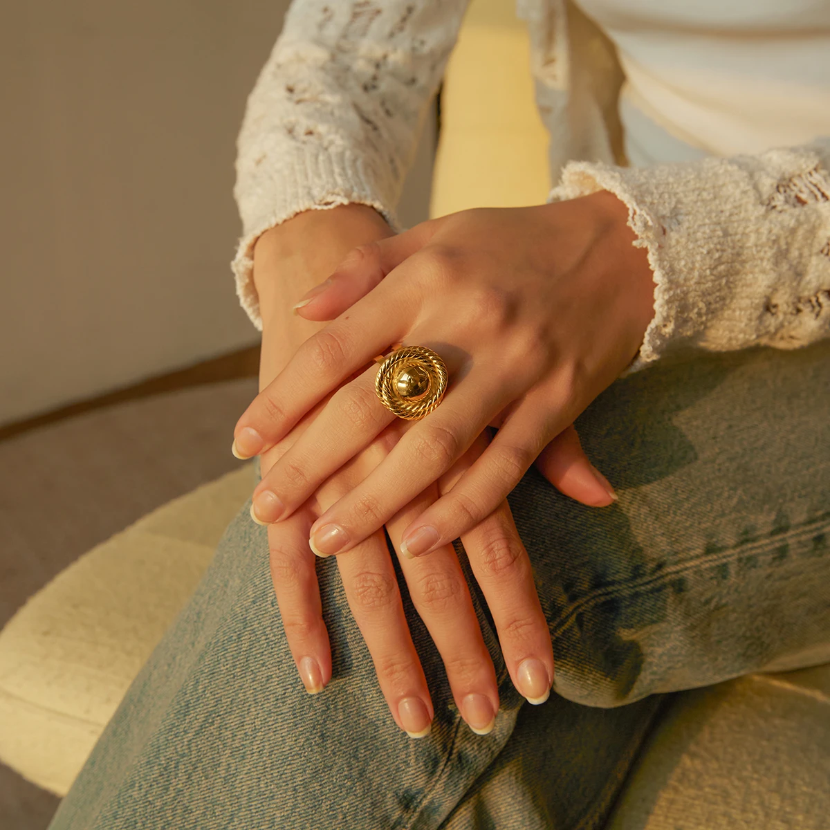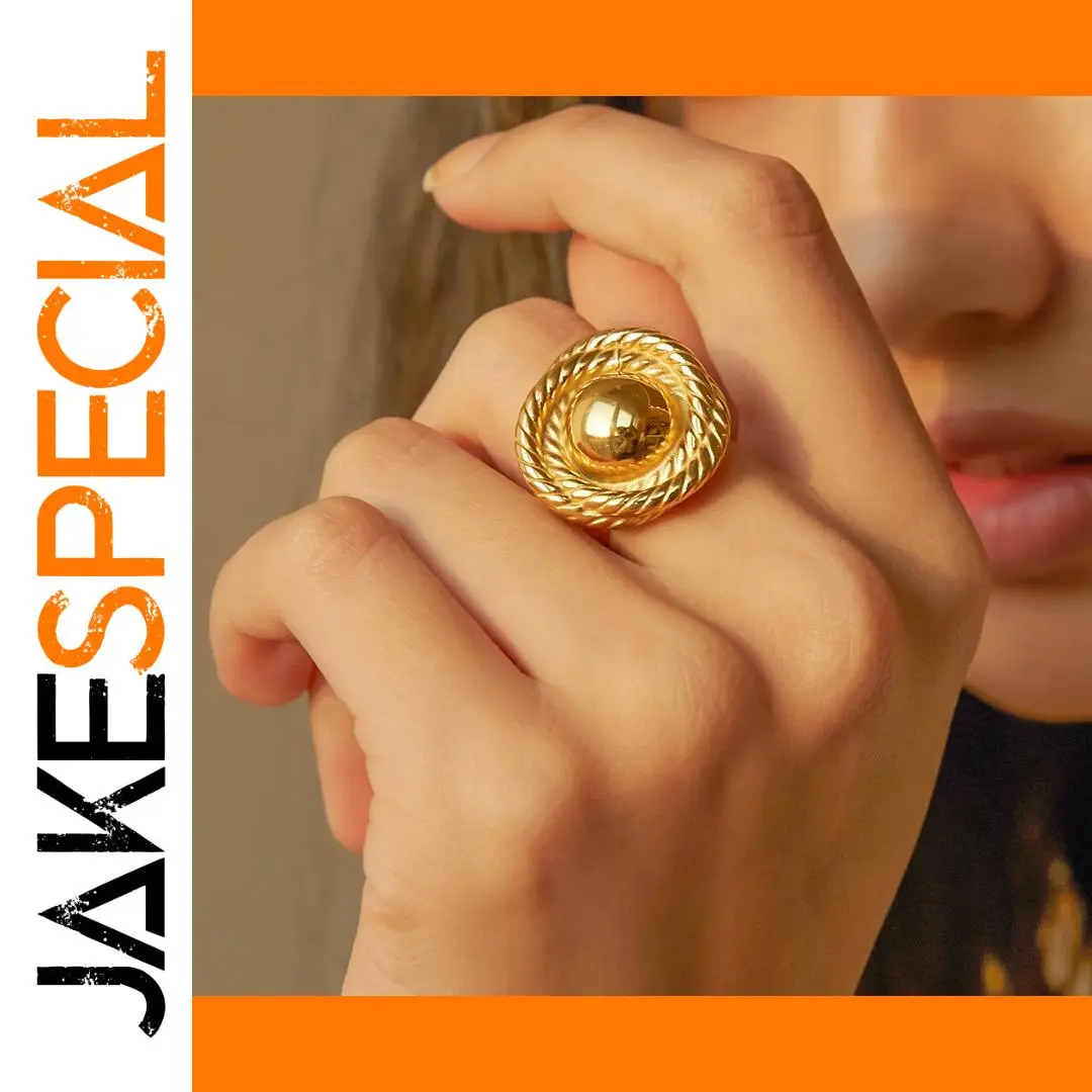 Experience timeless elegance with this women’s open ring featuring a retro spiral circle design. Crafted from durable stainless steel and coated with PVD gold, it boasts a shiny, lustrous finish that resists fading, scratching, and water. Weighing approximately 15 grams, this sizable piece offers a luxurious look, making it perfect for parties or stylish occasions. Its round shape and intricate textured border emphasize a vintage-inspired, trendy aesthetic, blending classic sophistication with modern flair. Free from nickel, lead, and cadmium, this high-quality accessory ensures both beauty and comfort, elevating your jewelry collection with a statement piece that exudes elegance and durability.