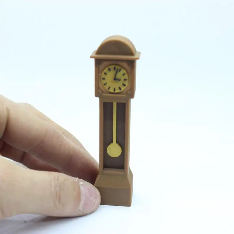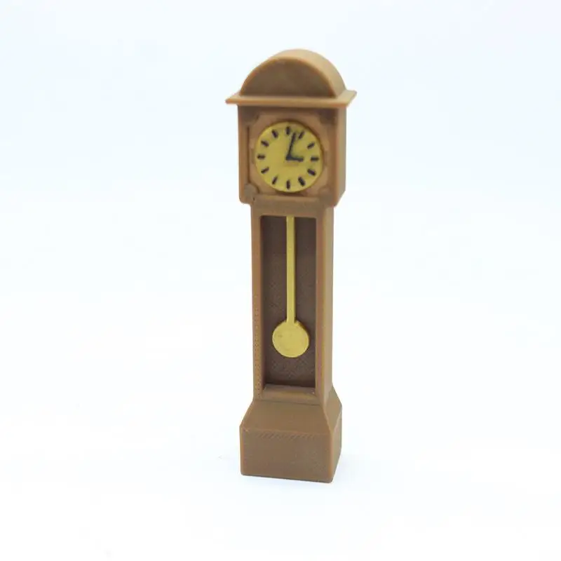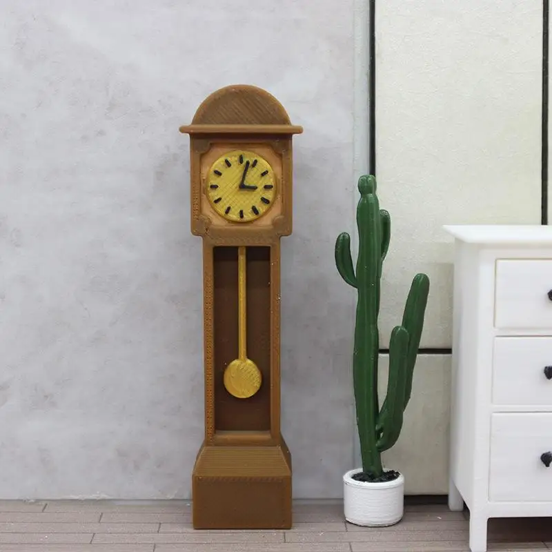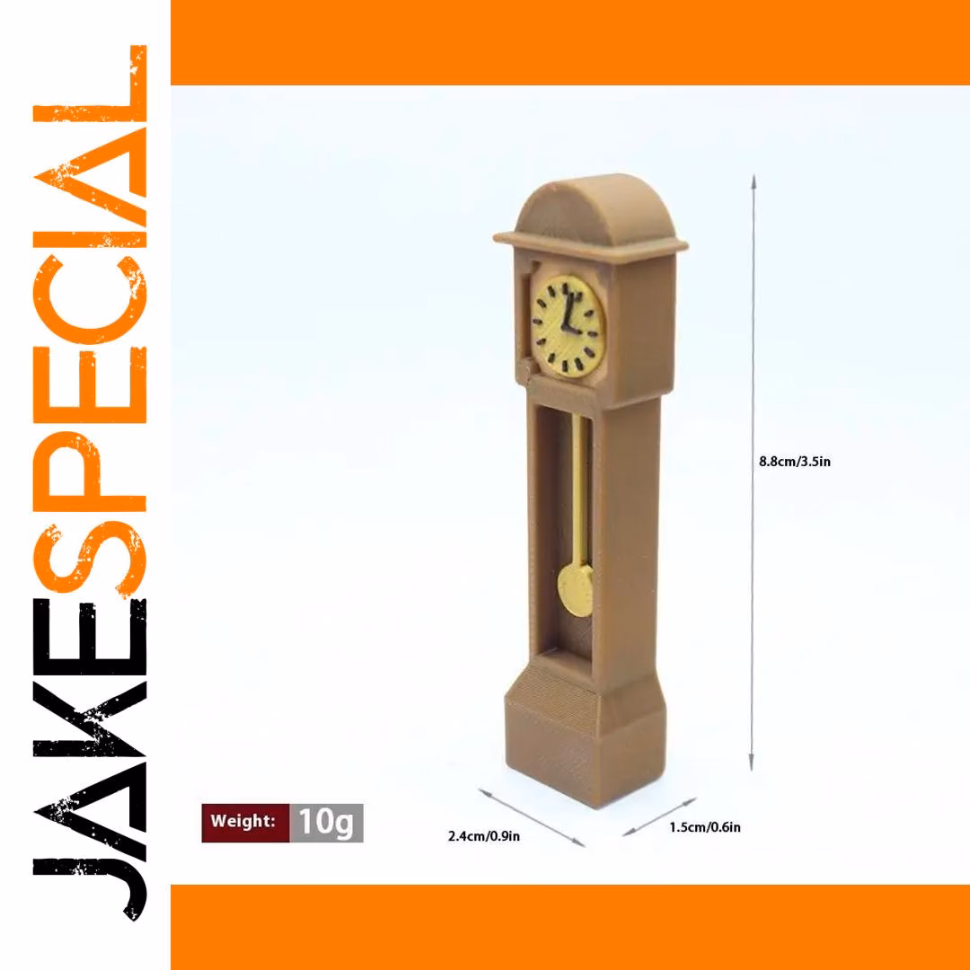 Bring vintage charm to your dollhouse collection with this mini retro standing clock model. Measuring 2.4 cm wide, 1.5 cm deep, and 8.8 cm tall, it features a sleek rectangular design with a smooth, resin finish in a bright, durable color. The clock showcases a classic circular face with black markings on a yellowish background, a curved arch-like roof, and a tiny, removable yellow pendulum for added realism. Made from high-quality PLA with a resin composition, it includes functions such as accurate time display, alarm, and timer, making it both a decorative piece and a functional accessory for dollhouses, suitable for ages 14 and up.