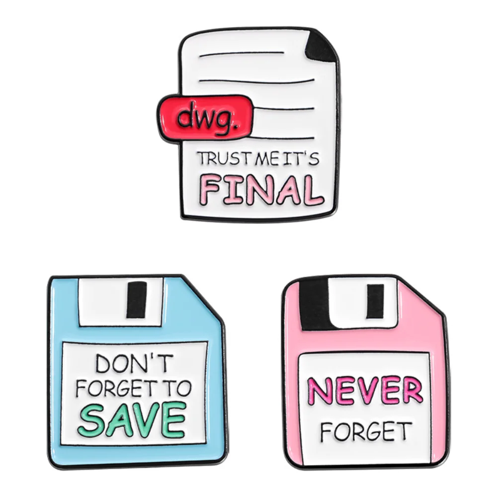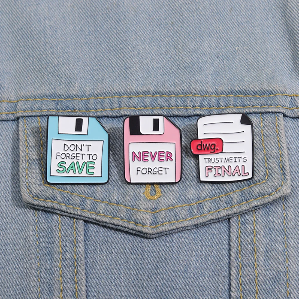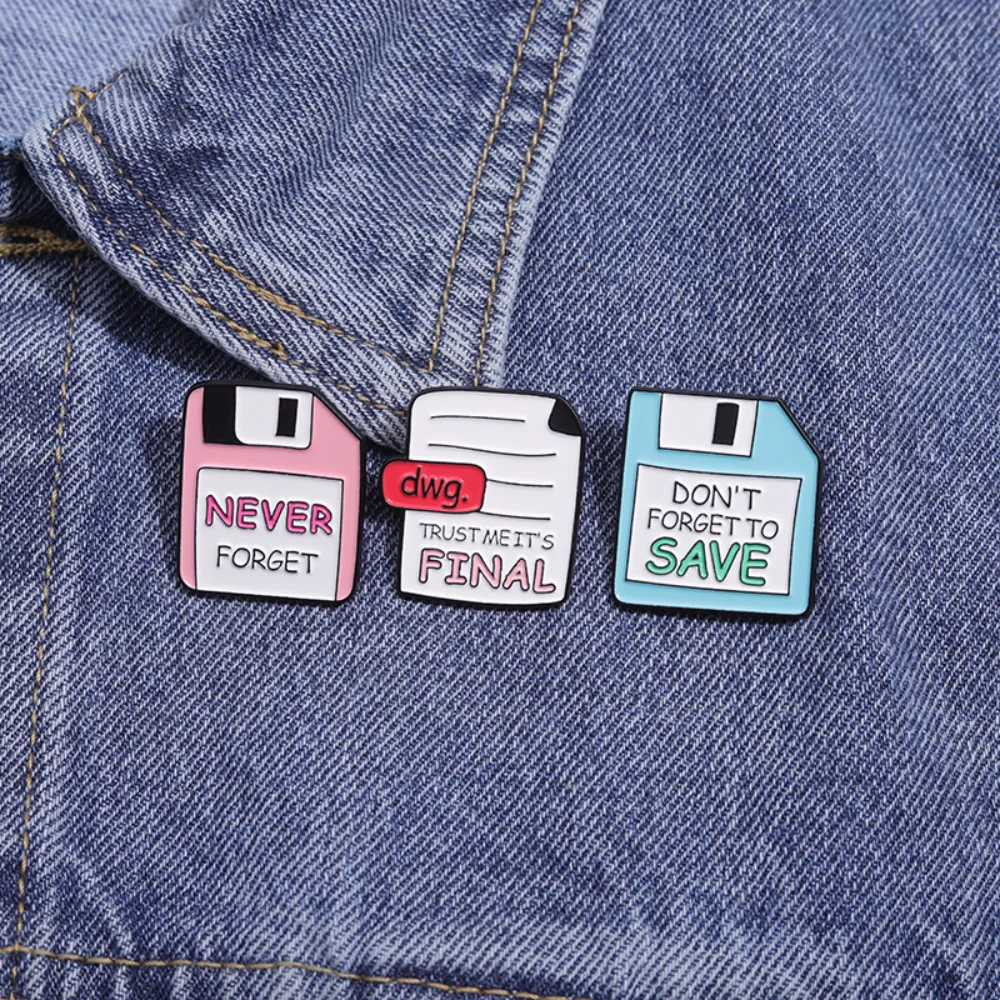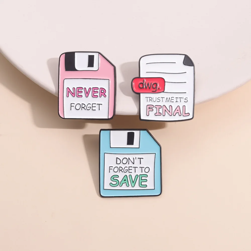 Experience the unique charm of the Retro Tech Style Floppy Disk File Brooch set, perfectly designed for nostalgic tech enthusiasts. This vibrant set includes three brooches made of durable alloy, showcasing a harmonious blend of retro aesthetics and playful text. The top brooch resembles a humorous document with a striking red label, while the two floppy disk brooches in blue and pink each bear fun, motivating phrases. Use these eye-catching accessories to express your personality on jackets, backpacks, hats, or for DIY clothing projects, embracing a trendy, unisex style that adds flair to any outfit.