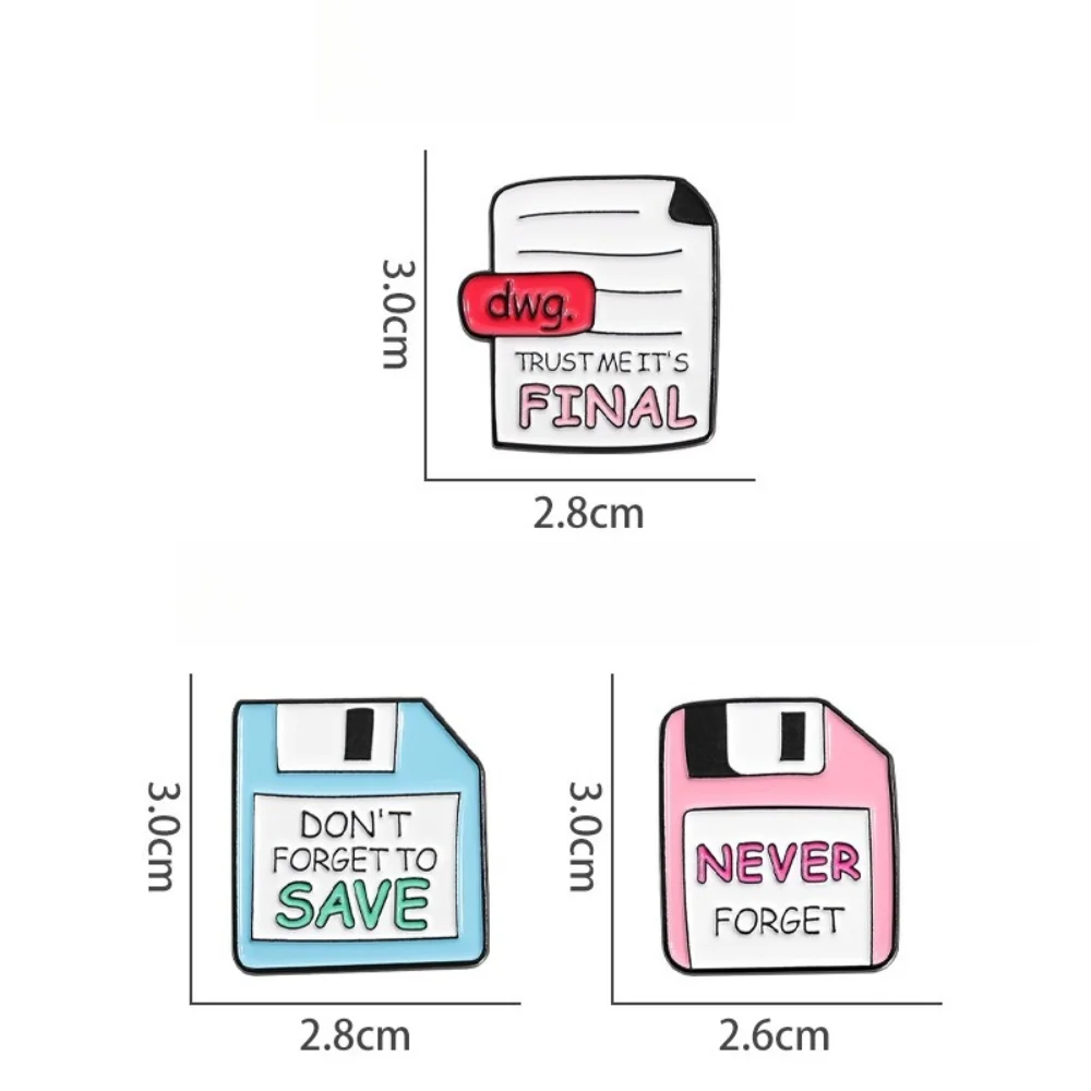 - Creative Design: Three unique brooches inspired by retro tech with humorous inscriptions.