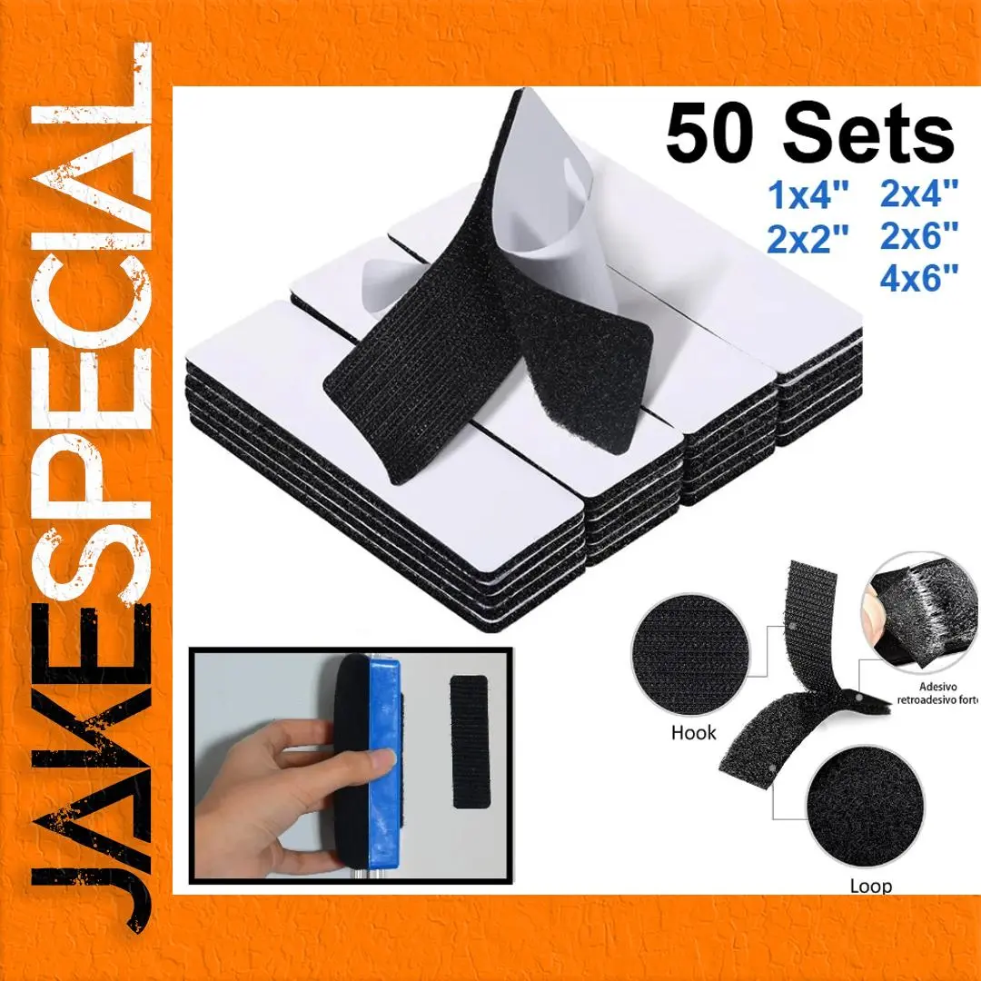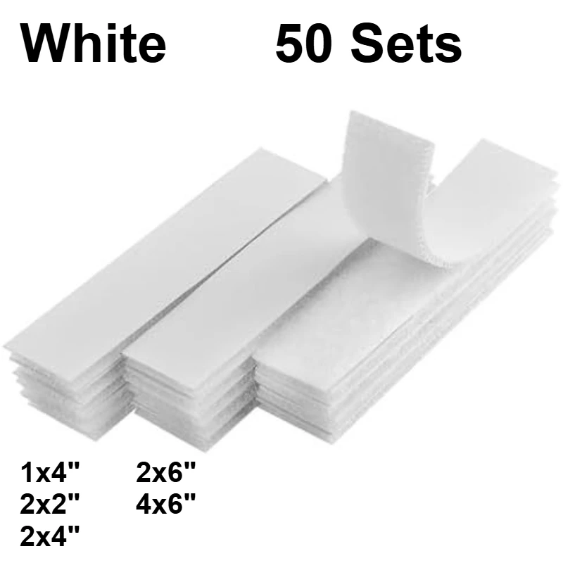 - Includes 50 high-strength hook and loop strips in five sizes: 1×4″, 2×2″, 2×4″, 2×6″, and 4×6″, suitable for various lightweight fastening needs.