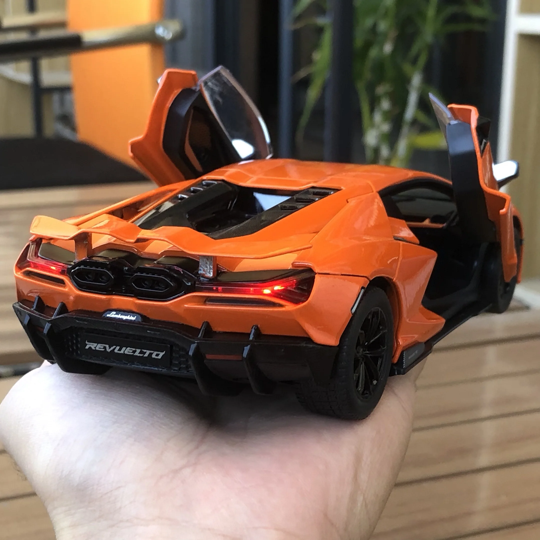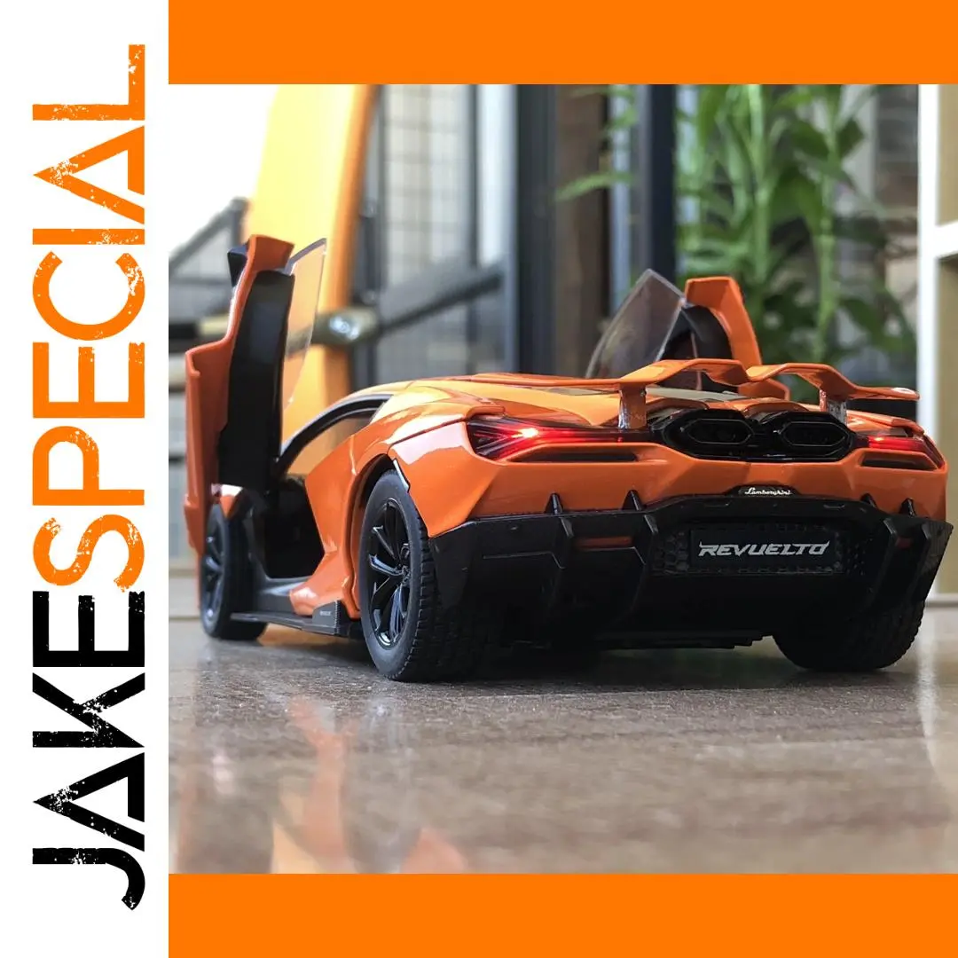 Experience the thrill of owning this stunning 1:24 scale Revuelto supercar diecast model, meticulously crafted with a glossy orange finish that highlights its sleek, aerodynamic lines. The model captures the essence of high-performance design with genuinely detailed features, including a low, wide stance, sharply sculpted body, and a prominent rear diffuser. Its narrow, LED-like taillights, twin exhaust outlets, and intricately designed rear wing elevate its realism and visual appeal. The black multi-spoke wheels and realistic tires add authenticity, making it an impressive desktop ornament or collectible masterpiece. Whether displayed on your desk or shelf, this model allows you to enjoy the sophisticated aesthetics of a modern supercar right at home. Perfect for enthusiasts and collectors alike.