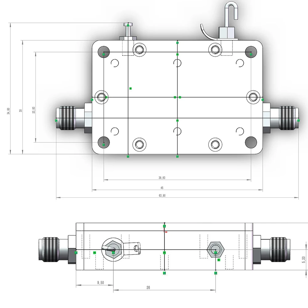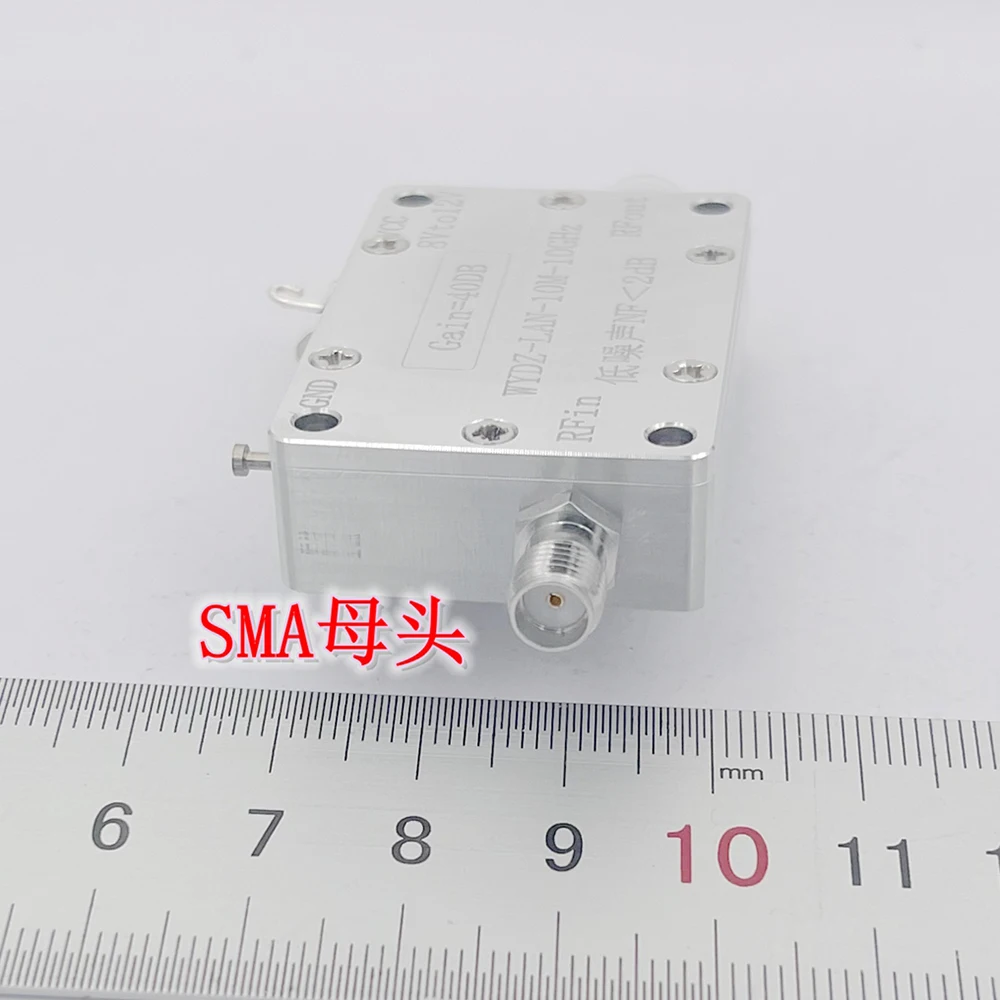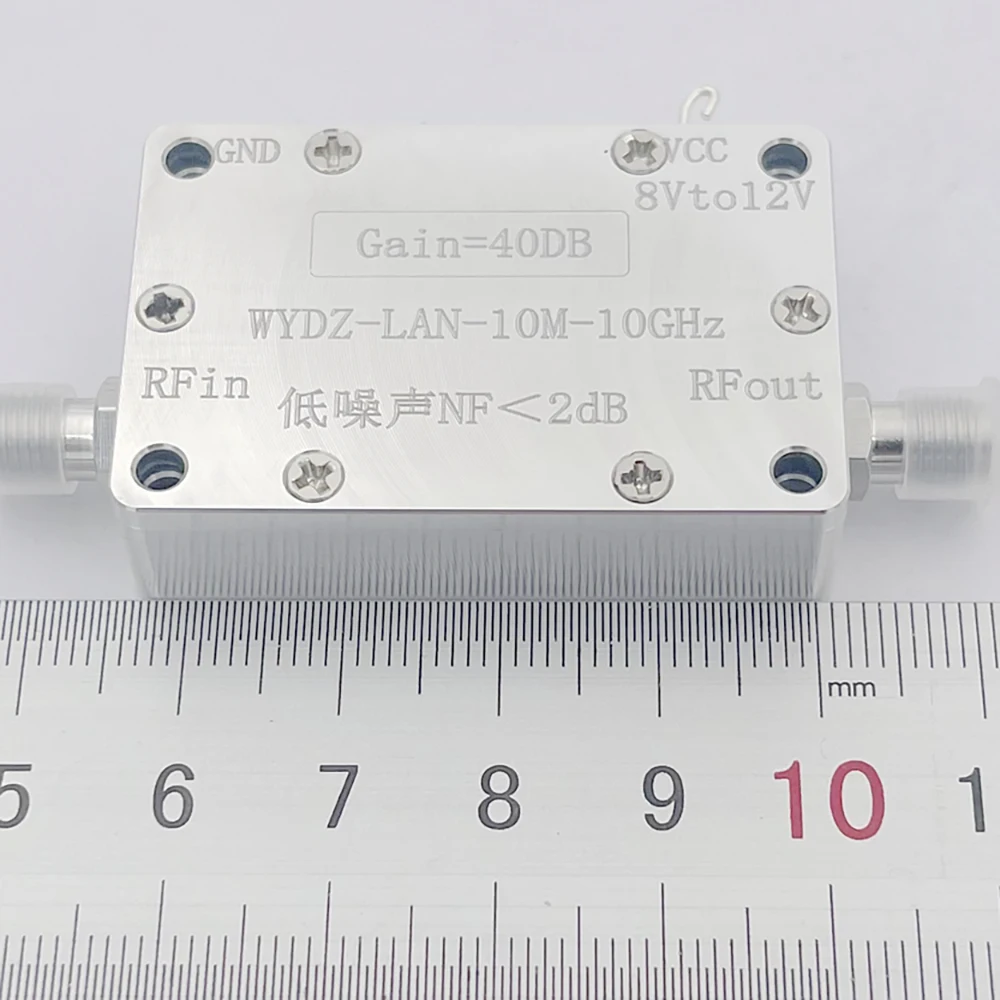 Experience high-performance signal amplification with this sleek broadband RF amplifier, operating from 10 MHz to 10 GHz. Equipped with a 40 dB gain, a flat frequency response, and a P1dB output power of over 20 dBm, it ensures reliable signal boosting across wide applications. The amplifier features a noise figure of no more than 2.5 dB, 50-ohm input/output impedance via 3.5 mm SMA female connectors, and a compact size of 45 x 30 x 2 mm (excluding connectors). Powered by +8V to +12V, consuming approximately 160 mA at 9V, making it ideal for receiver systems, mixer drivers, and signal drive applications in RF and communications setups.