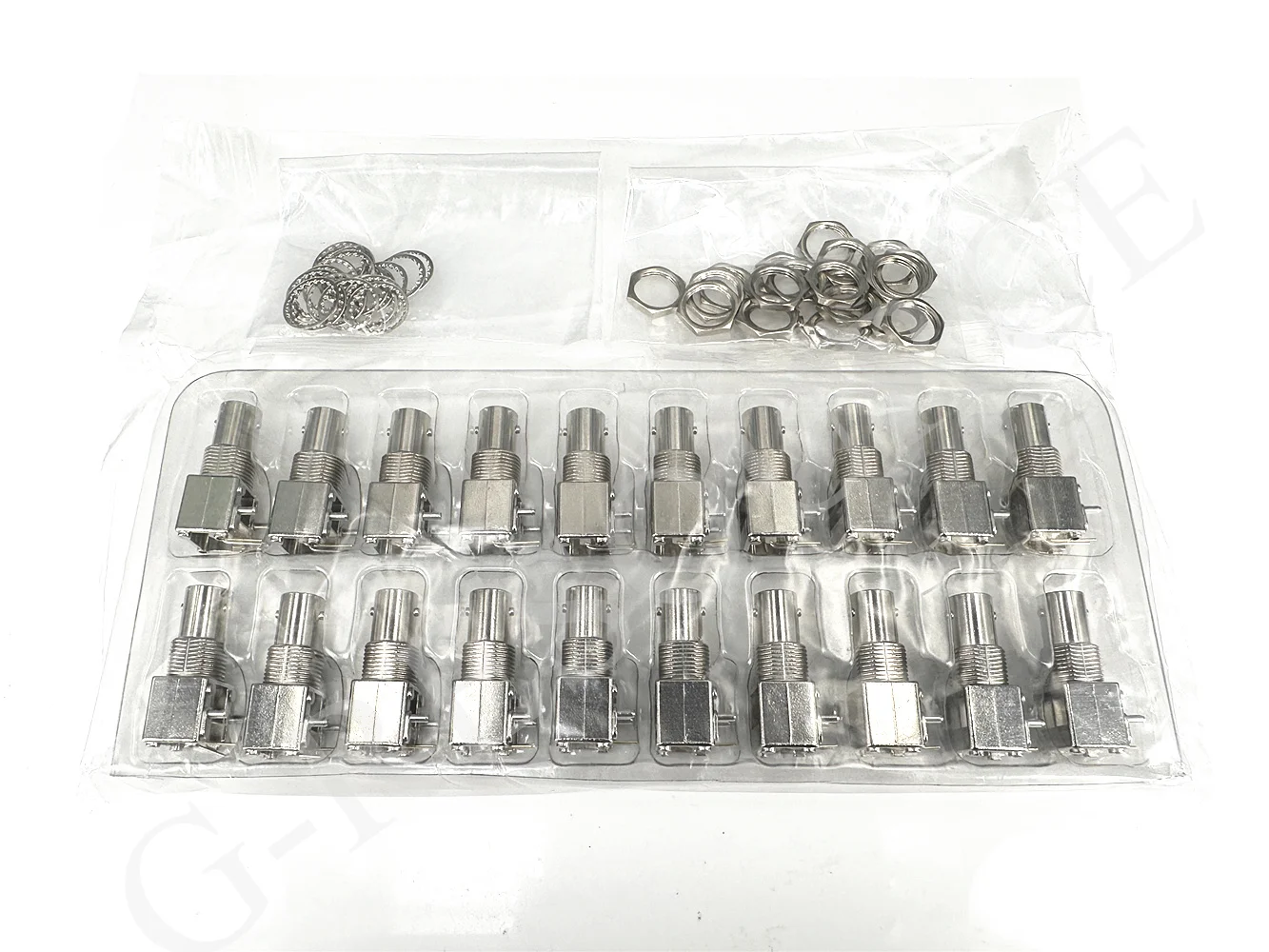 This set of two RF head BNC female connectors features a sleek, metallic finish with a precise 90-degree integrated design, ideal for space-saving installation on PCB boards. Each connector boasts a BNC-KWE female interface compatible with Q9 antennas, making them perfect for video monitoring and communication setups. Designed for durability and reliable connections, they include a central 4th pin for secure positive mounting. Crafted from high-quality materials, these new connectors are suitable for professional electronic and communication applications, offering a modern, industrial aesthetic with polished metal surfaces, sharp edges, and textured mounting components such as hexagonal nuts and retaining rings for easy, secure installation.