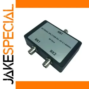 This compact, fully assembled antenna splitter features a sleek black plastic casing with a modern, utilitarian design. Operating within a frequency range of 100 kHz to 50 MHz, it offers 50-ohm impedance at both input and output ports, ensuring reliable signal distribution. Equipped with one antenna port and two receiver ports, it provides an impressive average port-to-port isolation of 36 dB and a signal attenuation of only 3.2 dB. The device includes three high-quality BNC connectors with a shiny silver finish, contrasting against the matte black casing. Ideal for RF, TV, or satellite signal distribution, this splitter combines precise functionality with a clean, technical aesthetic.