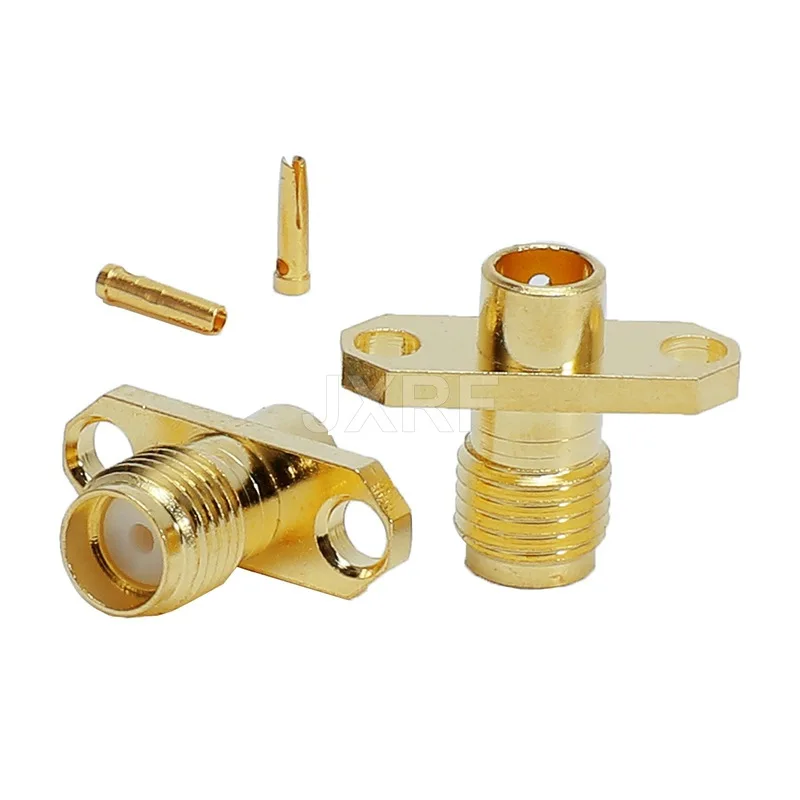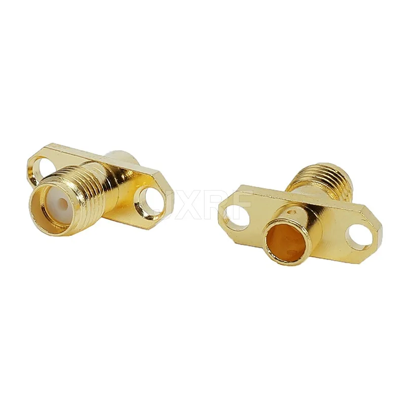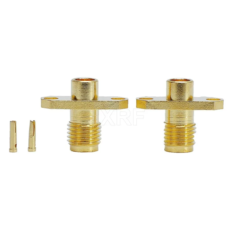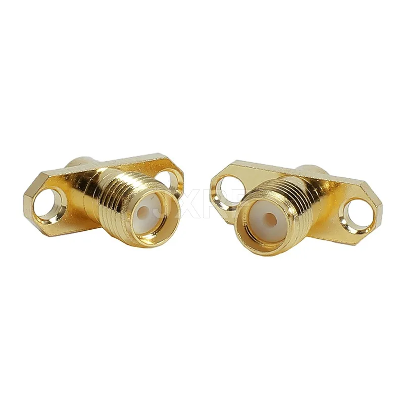 Experience a precise and reliable RF connection with this high-quality SMA female coaxial connector. Crafted from copper, it features a shiny, gold-plated finish that enhances durability and offers excellent conductivity. The connector’s distinctive diamond-shaped flange, with two mounting holes, allows secure attachment to various devices and equipment. Its threaded cylindrical body ensures a snug fit with semi-flexible cables such as RG402 and RG141, making it ideal for professional RF and communication applications. The accompanying threaded sleeve and elongated contact pin maintain consistent electrical contact while providing ease of assembly. The polished metallic surface and geometric design provide a sleek, high-end aesthetic. Trust this connector to deliver durable, high-performance connections essential for your RF systems and projects.