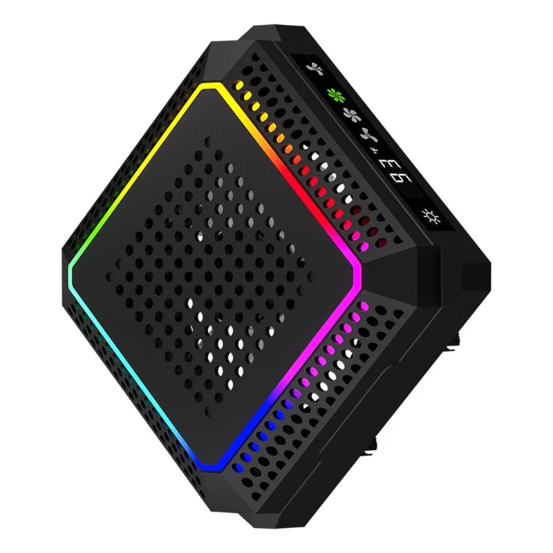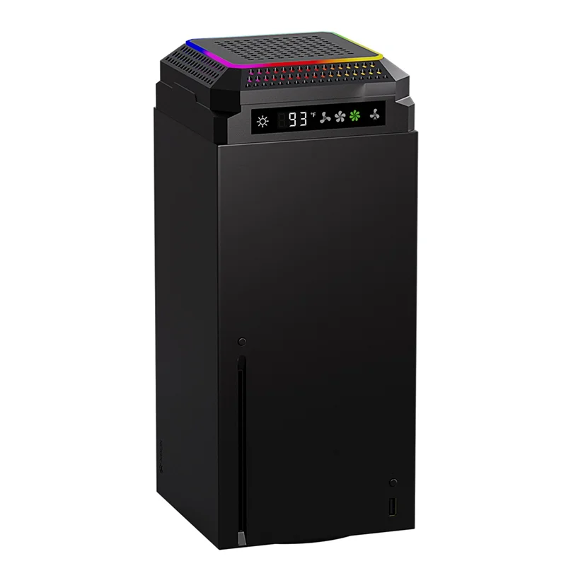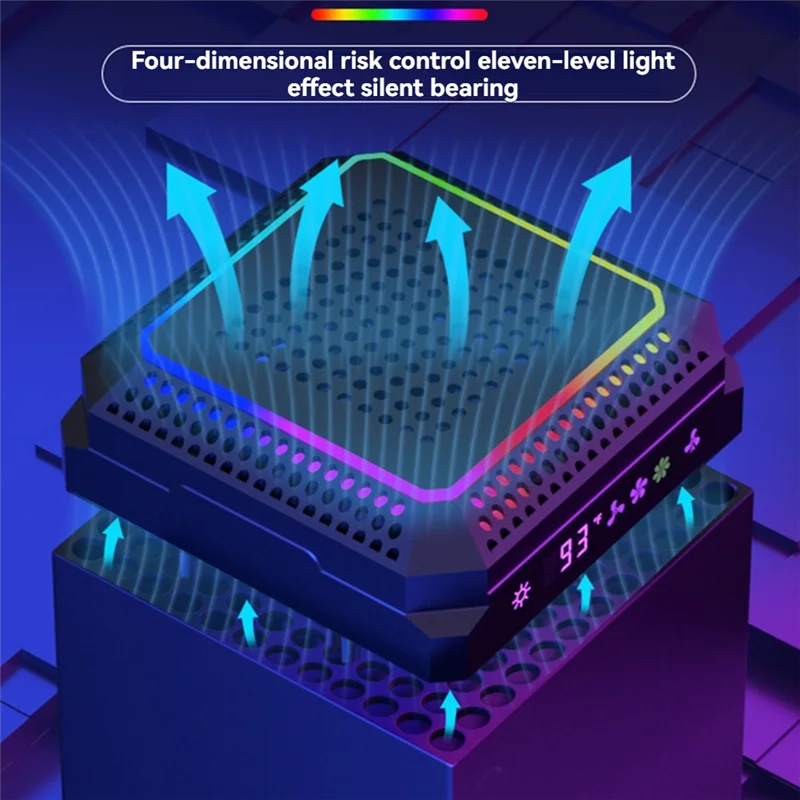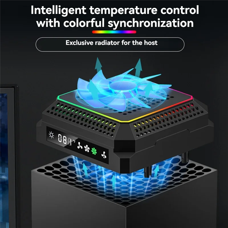 Experience a sleek upgrade with this high-performance RGB cooling fan designed specifically for your Xbox Series X. Its black matte plastic exterior merges modern design with practical function. The top surface features a large square vent with circular holes, surrounded by vibrant multi-color LED strips that transition smoothly through a spectrum of colors, creating a dynamic and lively glow. The front digital display shows real-time temperature in Fahrenheit, with touch-sensitive icons allowing you to control lighting, fan speed, and other settings effortlessly. The side and bottom feature honeycomb ducts and perforations for optimal heat dissipation and noise reduction. Shock-absorbing sponge feet ensure stability during intense gaming sessions, making this a perfect blend of style, performance, and durability for your gaming experience.