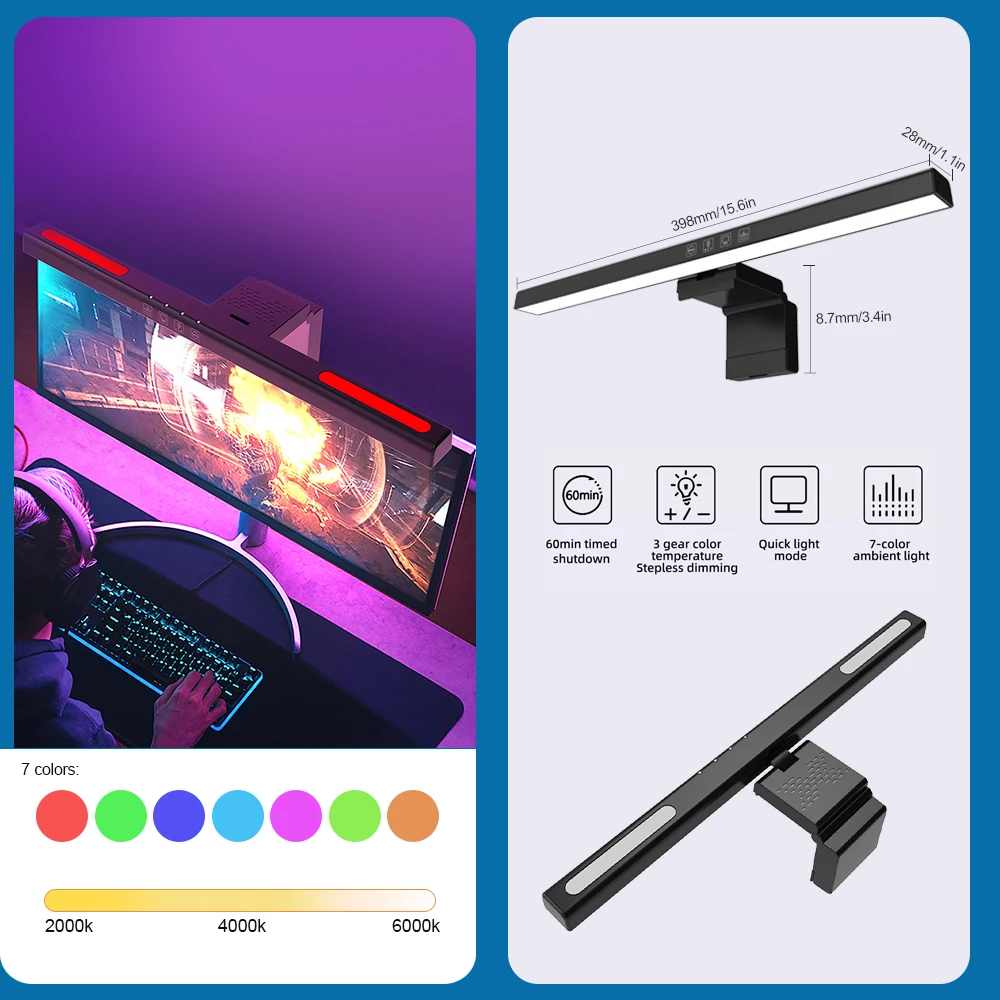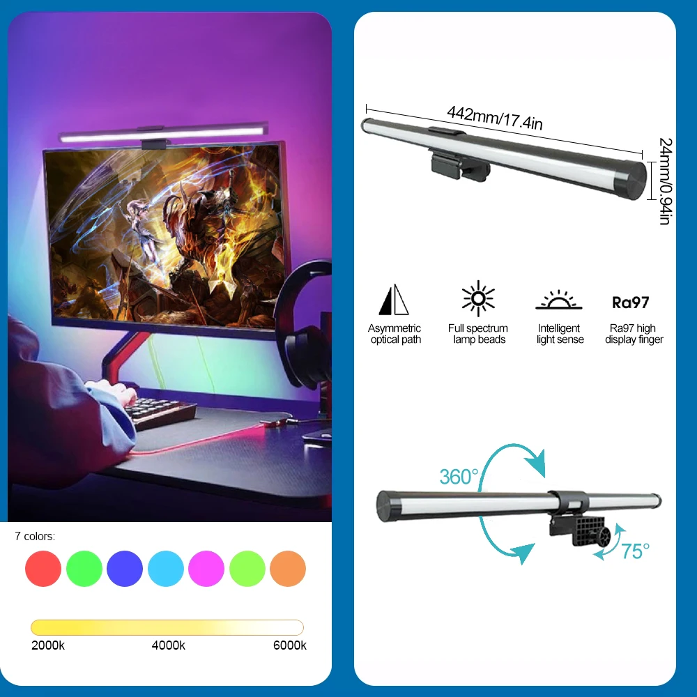 Imagine working or gaming with perfectly customizable ambient lighting that sets the mood and protects your eyes. This modern, minimalist light bar not only improves room aesthetics but also creates an immersive environment tailored to your preferences. Its sleek design and practical features ensure effortless integration into your setup, delivering comfort and style in one elegant package. Whether you seek better focus for work, vibrant lighting for gaming, or relaxing ambient light, this RGB screen hanging light bar helps you achieve the ideal atmosphere effortlessly. Elevate your environment now!