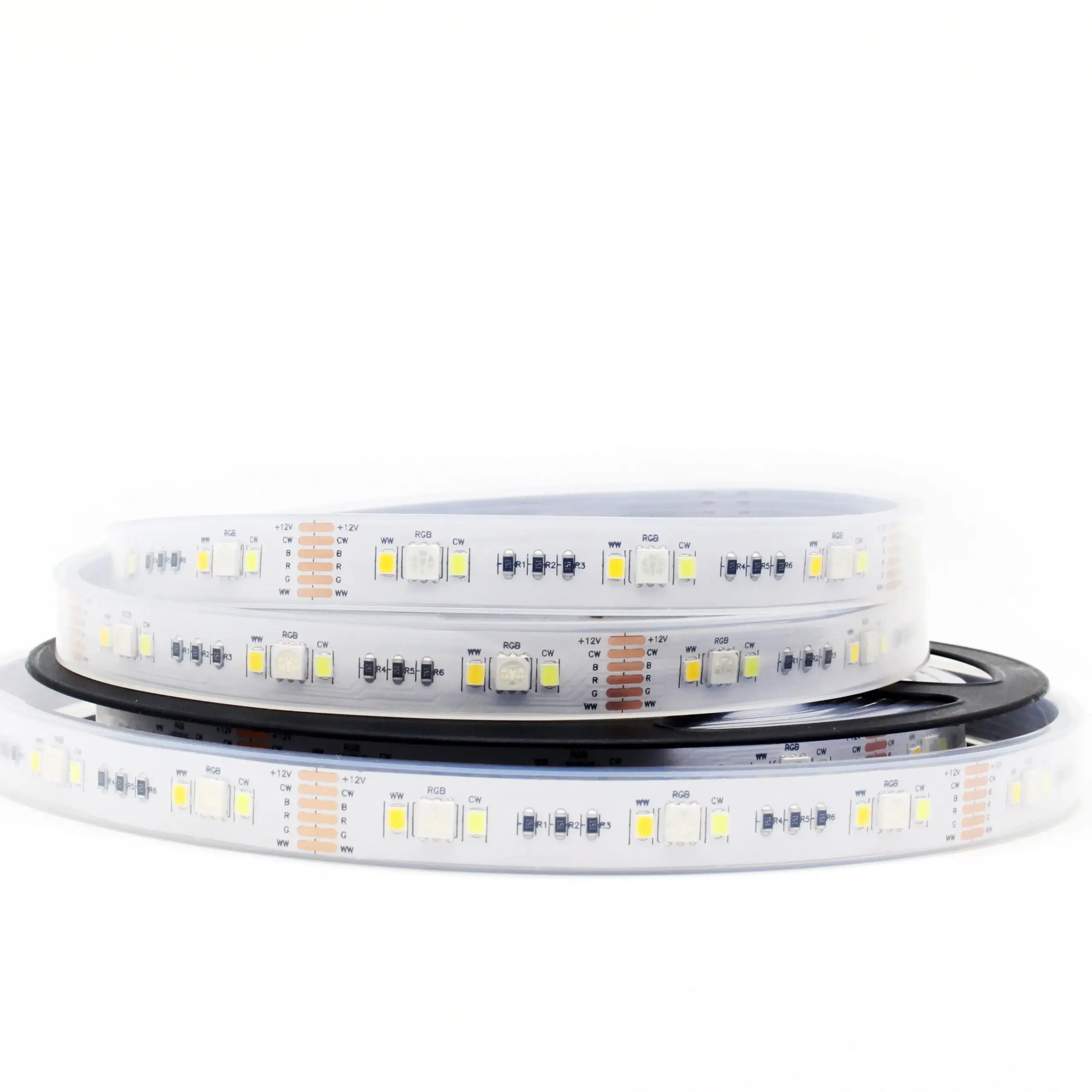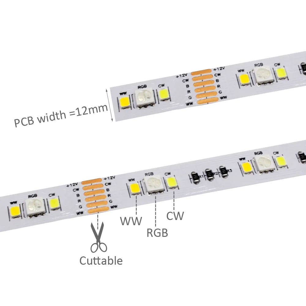 - High brightness and energy-efficient design with 90 LEDs per meter, including RGB, warm white, and cool white LEDs, total power consumption about 7.36W per meter, ideal for versatile lighting needs.