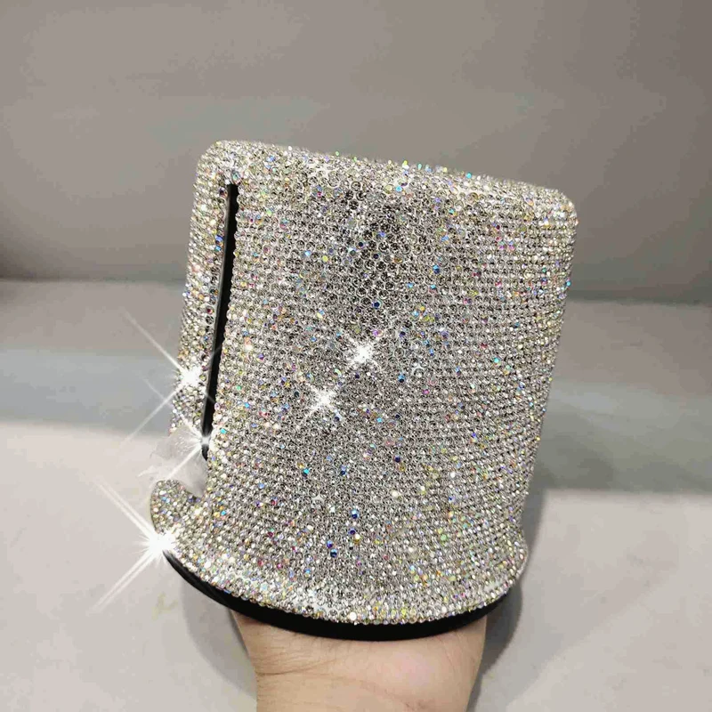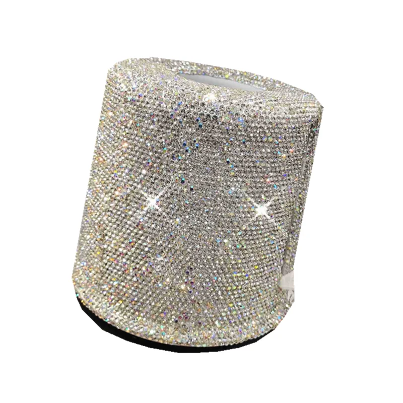 - This modern, cylindrical tissue box is adorned with dense rhinestones for a luxurious, eye-catching appearance, perfect for decorating elegant living spaces and adding sparkle to any room.