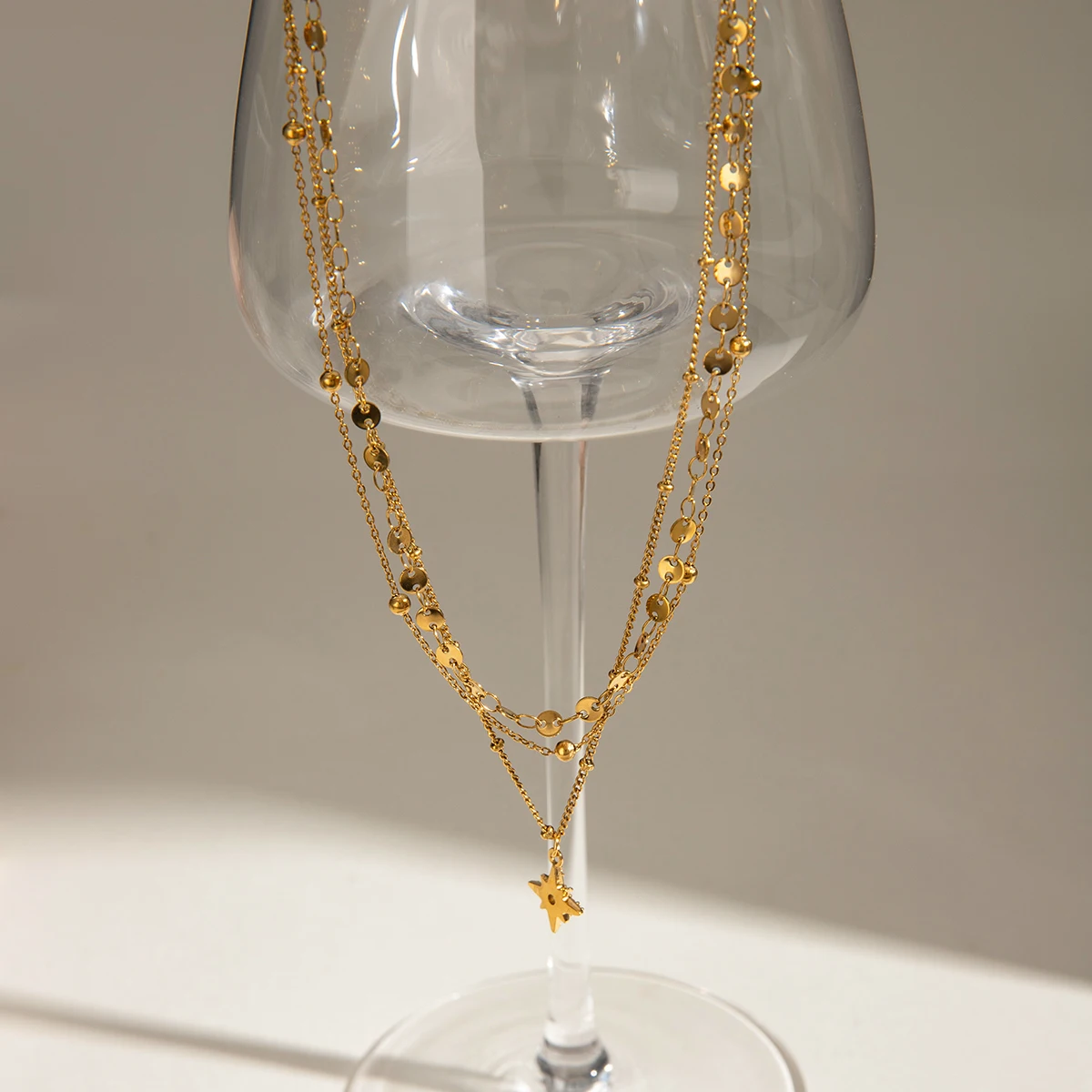 This stunning rhinestone star layered chain pendant necklace combines elegance and trendiness, making it a must-have accessory for any fashion-forward woman. Crafted from high-quality stainless steel, its waterproof texture ensures longevity while adding a touch of glam to your outfits. Whether you're dressing up for an anniversary or adding flair to your everyday wear, this necklace will help you stand out. Picture yourself wearing this exquisite piece, catching the light and drawing compliments from everyone around you. Let your beauty shine with a necklace that reflects your unique style.
