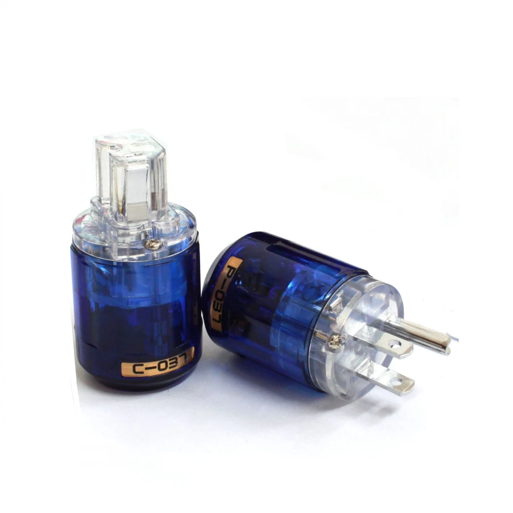 Experience premium quality with this stylish pair of connectors designed for high-end audio and power applications. The set features a transparent, vibrant blue housing that reveals the interior components, adding a modern aesthetic to your setup. Crafted with rhodium-plated surfaces, these connectors are highly resistant to corrosion, ensuring long-lasting durability and a reflective, shiny appearance. The female IEC connector (C-037) offers a secure latch to lock into place, while the male US power plug (P-037) sports three precisely polished prongs aligned to US standards. Made from robust anaerobic phosphor bronze with surface polishing, these connectors combine technical excellence with sleek design, perfect for audiophiles and professionals seeking reliable, high-performance components.