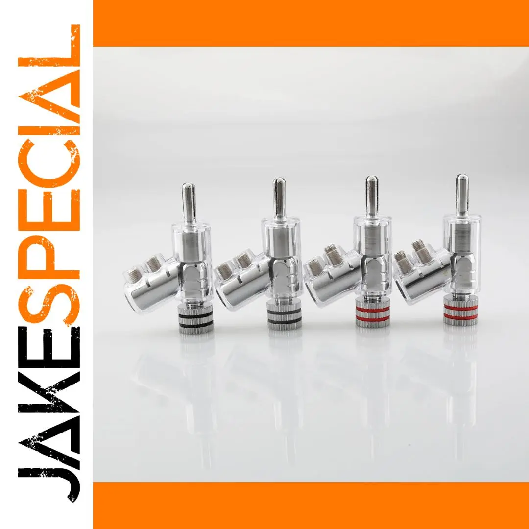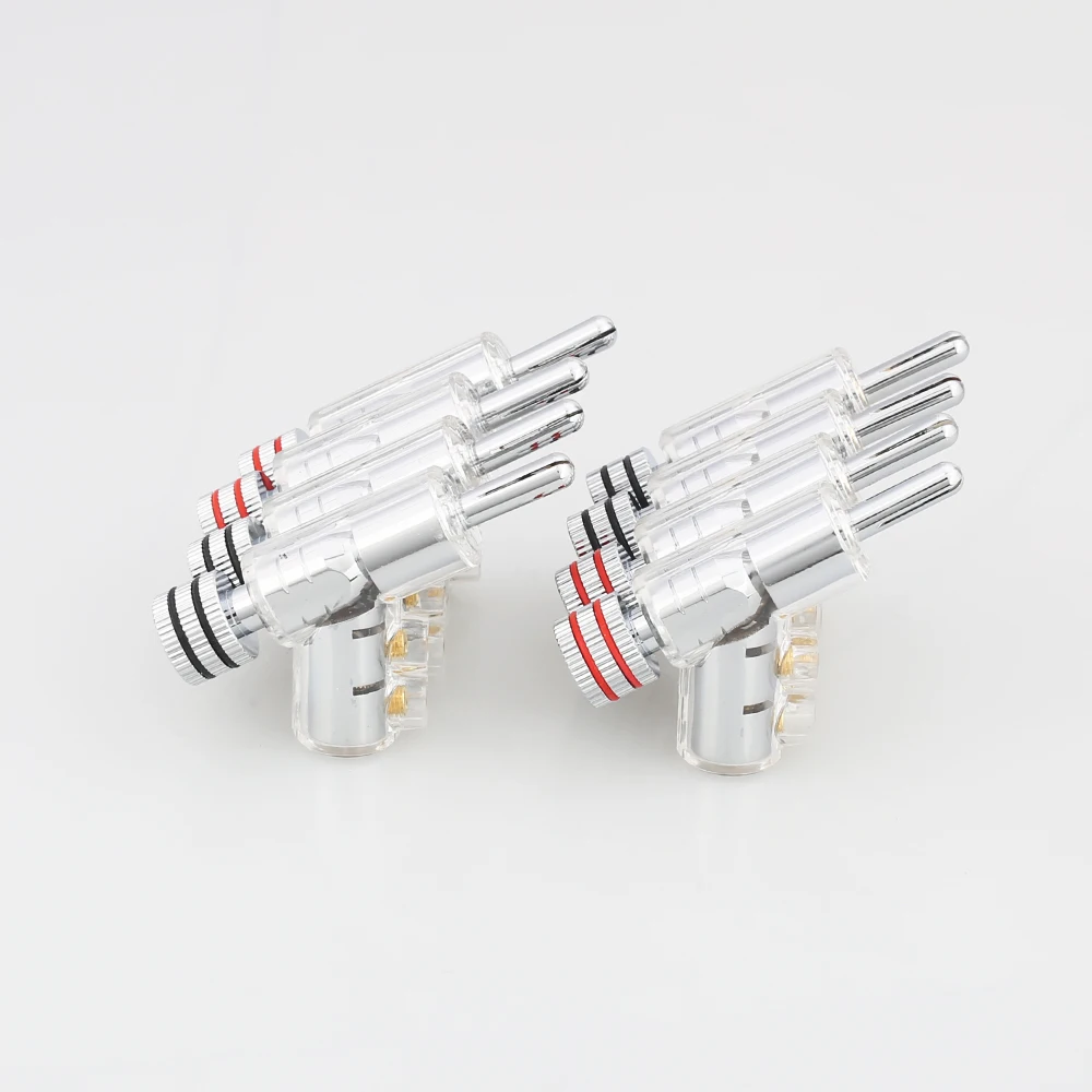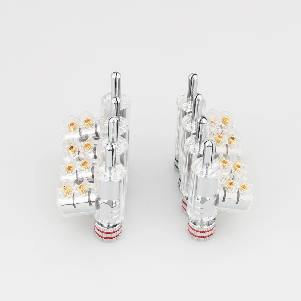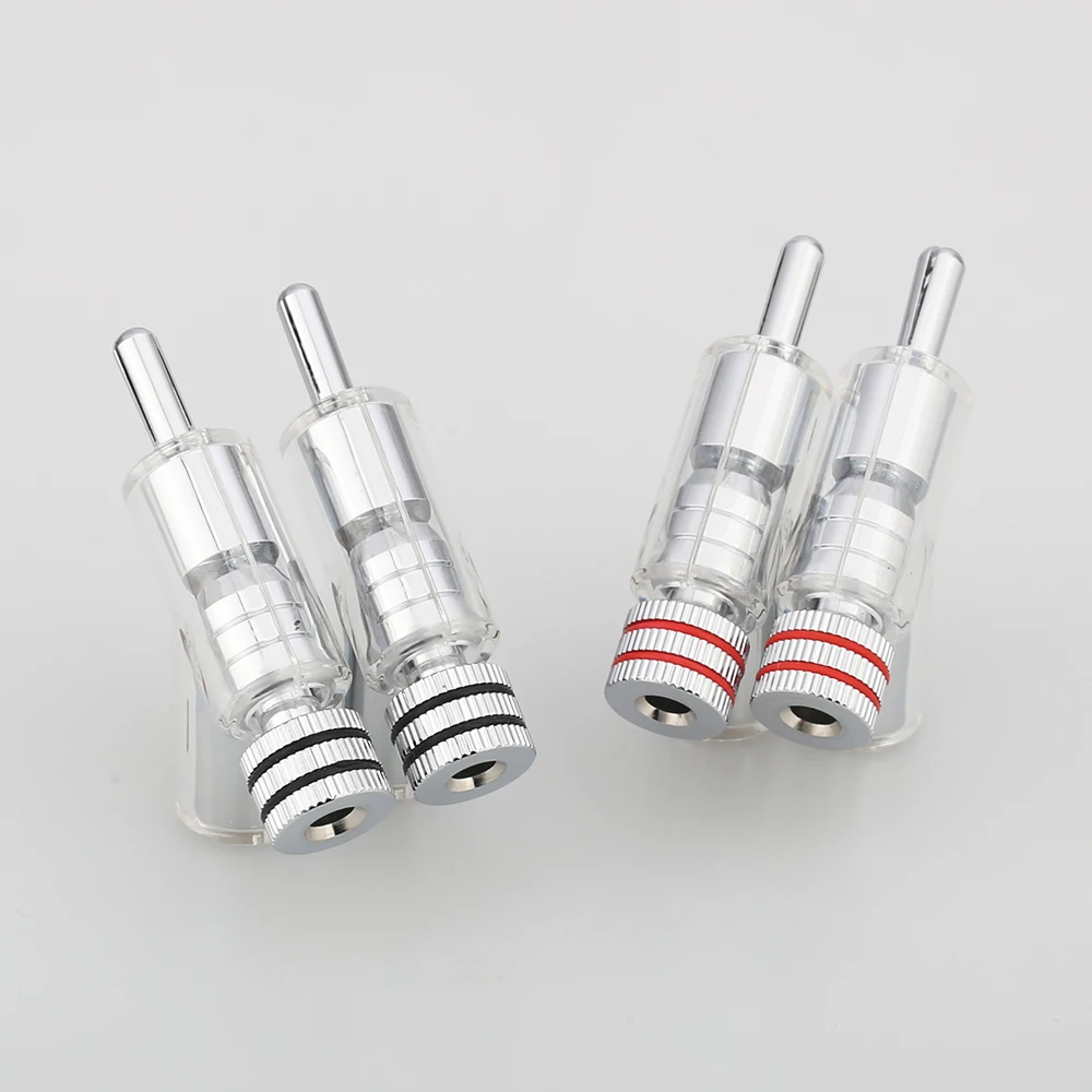 Experience premium audio connectivity with this set of four high-end, rhodium-plated lock speaker cable banana plug connectors. Designed for audiophiles and professionals, these connectors ensure optimal signal transmission, thanks to their thick gold coating and precise craftsmanship. Each 40mm connector features a sleek transparent body that showcases its internal components, combined with a polished silver finish for a modern aesthetic. The screw fastening mechanism provides a secure, solderless connection to speaker cables up to 6mm in diameter, minimizing signal loss and enhancing sound quality. The set includes two red and two black connectors, clearly indicating polarity. Their elegant, clean design seamlessly integrates with luxury audio setups, providing both style and performance.