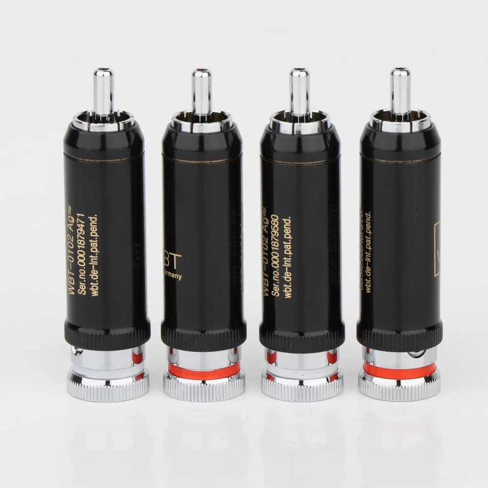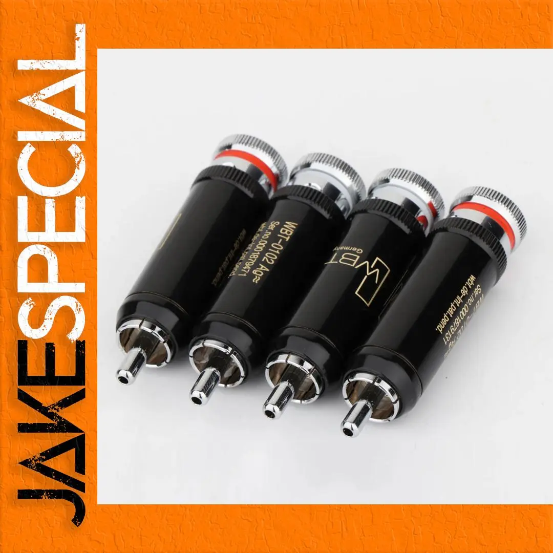 Experience high-quality audio connections with these rhodium-plated copper RCA plugs, measuring 52mm in length and 14mm in diameter, designed for professional-grade sound systems. Each plug features a durable, sleek black exterior housing with a textured silver-colored metal ring at the top and color-coded red and white bands for stereo channel identification. Suitable for wires up to 9mm diameter, these male RCA connectors ensure secure, corrosion-resistant connections. The package includes four pieces, making them perfect for upgrading or repairing audio signal cables in high-end audio equipment. Built for reliability and clarity, these connectors exemplify craftsmanship and attention to detail in professional audio applications.