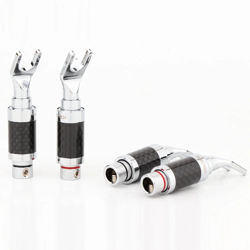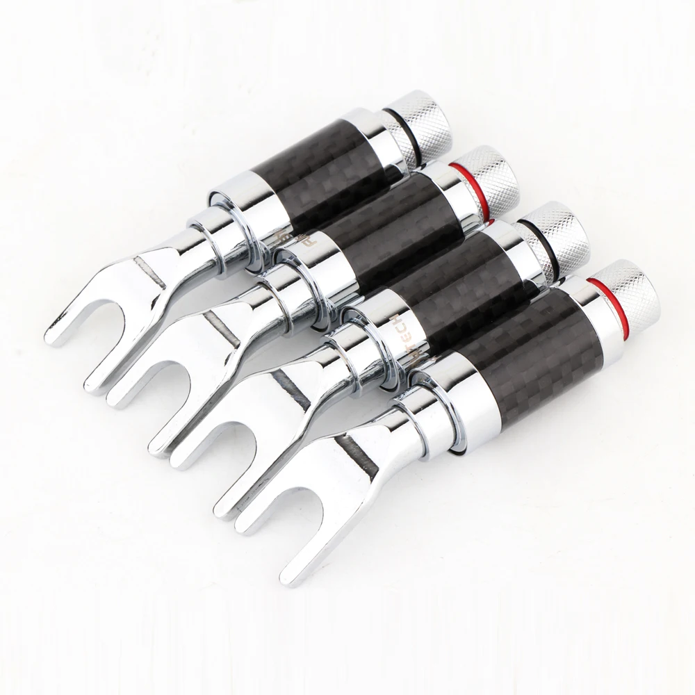 Imagine elevating your audio experience with this set of four meticulously crafted Rhodium Plated Y Spade Plug connectors. Designed for serious audiophiles, these connectors blend modern aesthetics with superior functionality. The polished, reflective stainless steel shells combined with a sleek black carbon fiber handle create a striking visual appeal while ensuring durability and a comfortable grip. The broad U-shaped fork securely attaches to speaker terminals, enhancing sound quality and connection stability. Their precise engineering makes installation effortless, aligning seamlessly with your premium audio equipment. You’ll appreciate the harmonious balance of style and performance, transforming your setup into a professional-grade system. These connectors are ideal for anyone aiming to achieve the clearest, most reliable speaker connections.