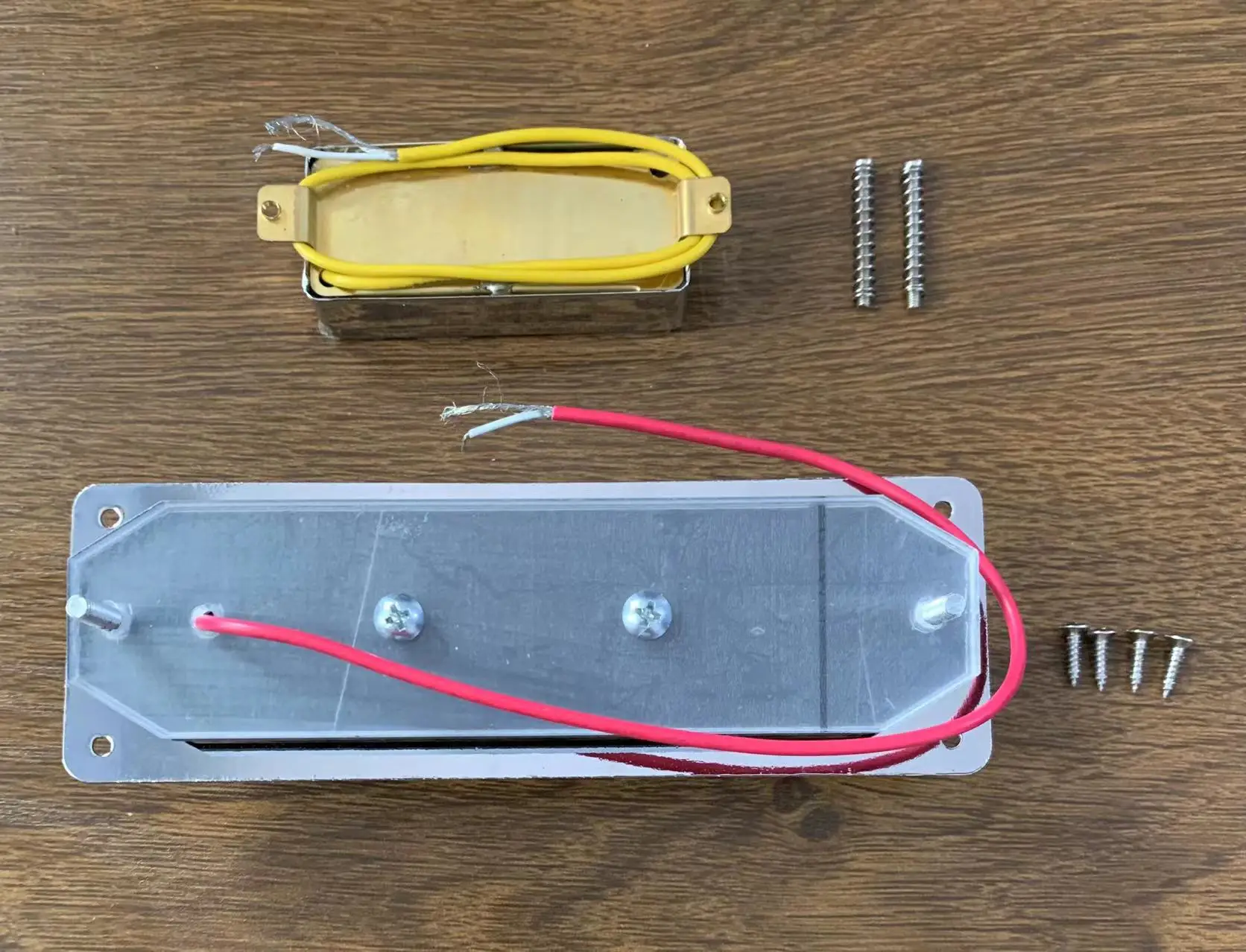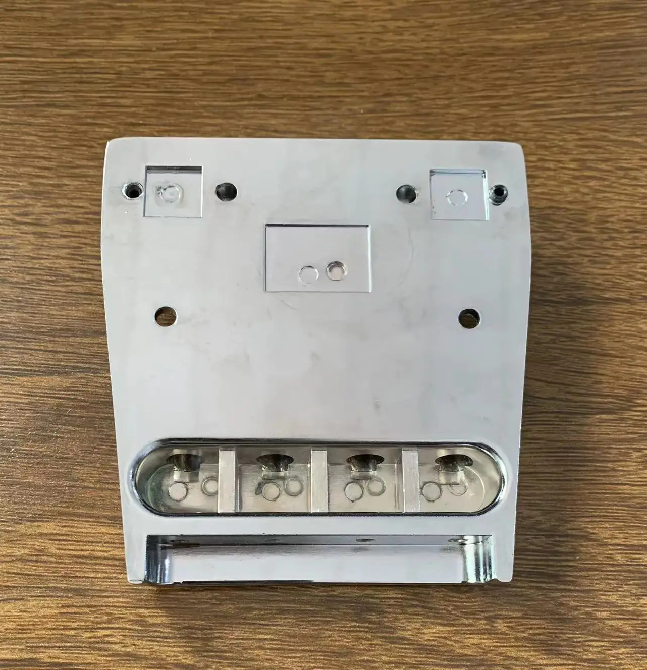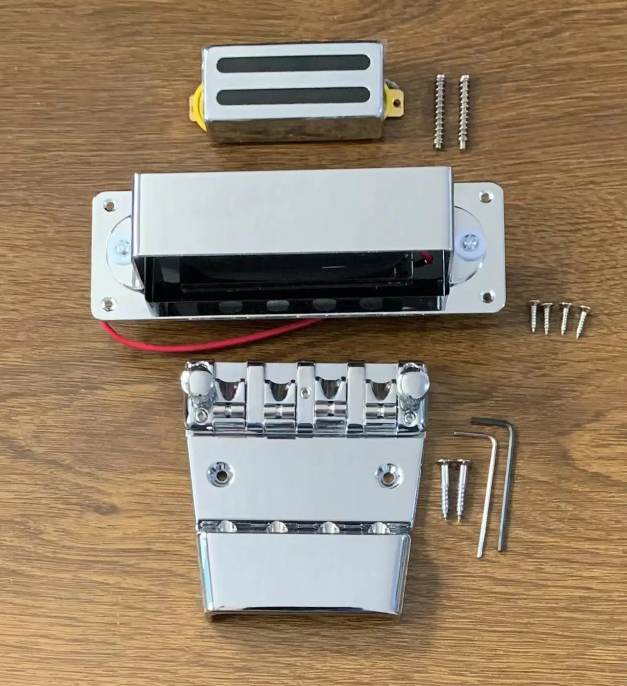 Enhance your musical expression with this sleek, professional-grade replacement set designed specifically for 4-string electric bass guitars resembling the iconic Ricken 4003. Crafted with polished, chrome-like finish, this assembly offers a modern, reflective aesthetic that adds visual appeal and durability to your instrument. The set includes a robust bridge and tailpiece with multiple adjustable saddles, ensuring precise string positioning for optimal sound and playability. Complemented by a metallic electronic component with a contrasting yellow protective cover, these parts blend functionality with style. Made with high-quality materials, this set guarantees long-lasting performance, seamless installation, and a polished look that complements any bass guitar. Whether upgrading or repairing, this set promises professional results and improved sound quality.