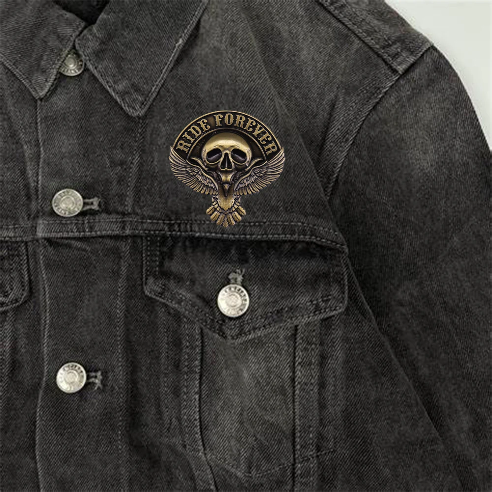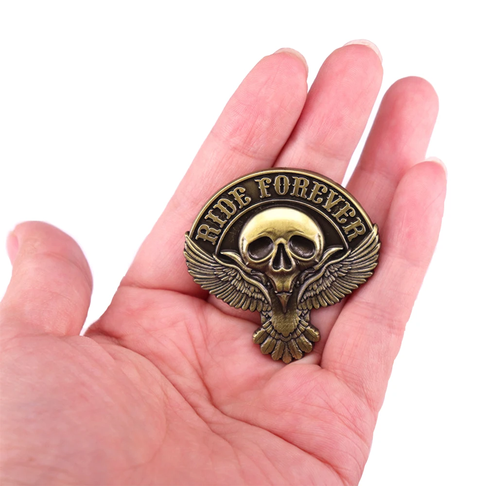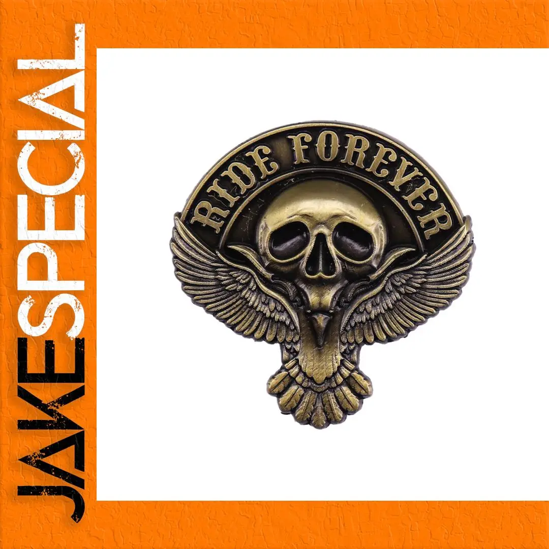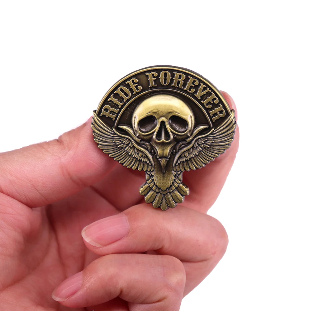 The Ride Forever Skull Badge is an exquisite vintage enamel pin tailored for motorcycle enthusiasts. At its center lies an intricately crafted skull, designed with pronounced eye sockets and a distinctive jawline, embodying a bold artistic statement. The stylized wings flanking the skull add an element of motion, perfect for the adventurous spirit of motorcycle culture. Above the skull, the striking words “RIDE FOREVER” are embossed in a vintage-inspired font. Crafted from durable metal alloy with a captivating bronze finish, this pin measures approximately 4.5 cm by 4.5 cm, making it an ideal accessory for both men and women. Perfect for various occasions, it brings a unique touch to any outfit.