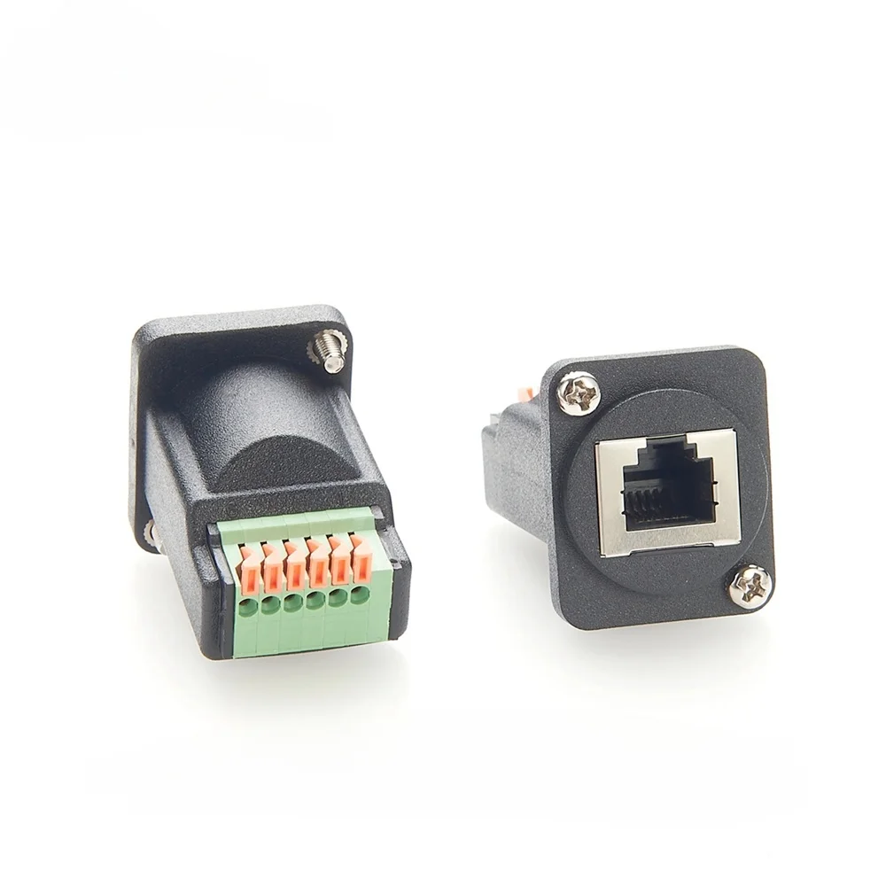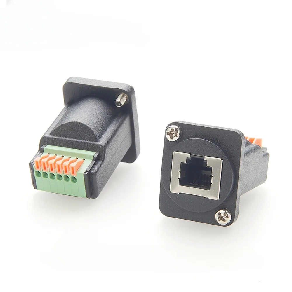 The RJ12 6P6C Panel-Mount Adapter with gold-plated contacts features a durable black matte PVC housing with a white border around the RJ12 female port for clear identification. Equipped with gold-plated pure copper contact pins for superior signal transmission and resistance to corrosion, it supports tool-free wiring via a 6-pin push-and-release terminal block. The adapter includes a D-type threaded panel-mounting tab for secure installation and measures with dimensions specified in the provided drawings. Designed for professional network and electrical applications, it offers reliable, high-quality connectivity with a sleek, robust finish in PCM-0488 color code, ensuring long-lasting performance in technical environments.